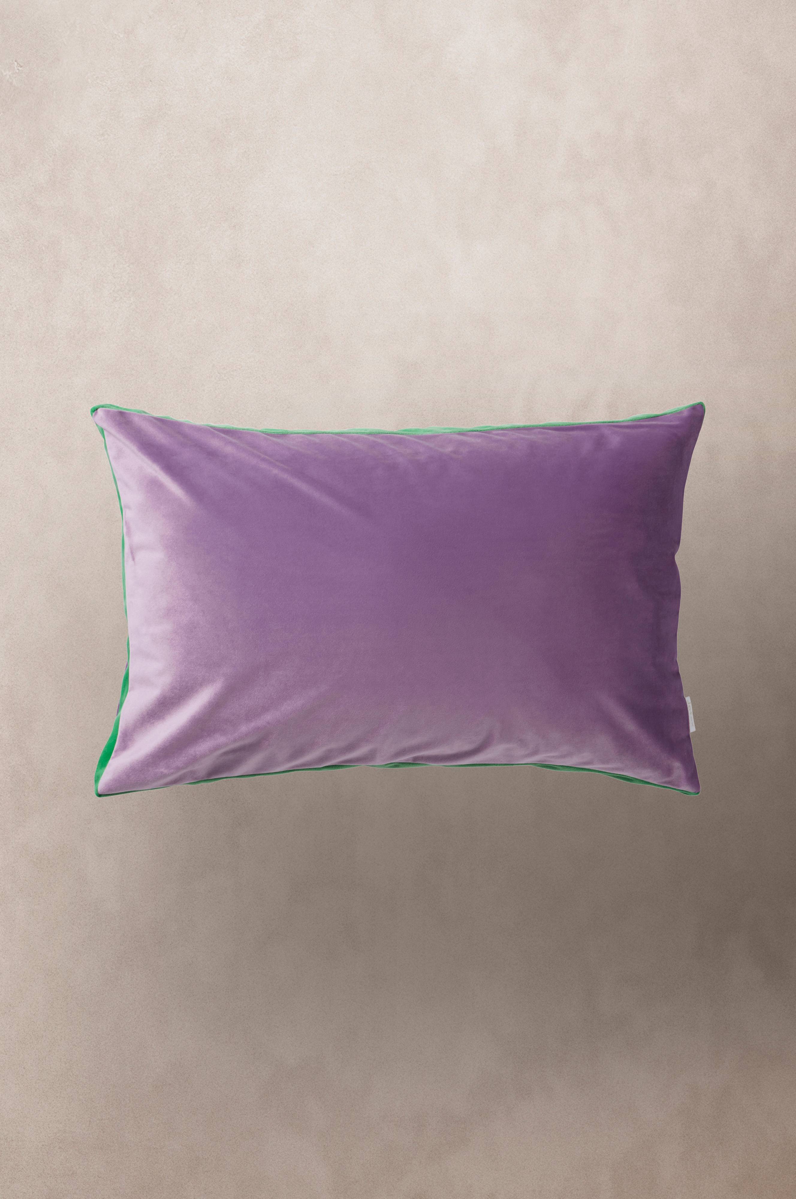 Poszewka na poduszkę wykonana z gładkiego, poliestrowego aksamitu, który w połowie pochodzi z recyklingu. Wokół poszewki biegnie lamówka w kontrastującym odcieniu. Połyskliwy aksamit jest miękki w dotyku i mieni się różnymi odcieniami w zależności od kąta padania światła. W dolnej krawędzi wzdłuż lamówki poszewka ma ukryty zamek błyskawiczny. Gramatura tkaniny 210 g/m².