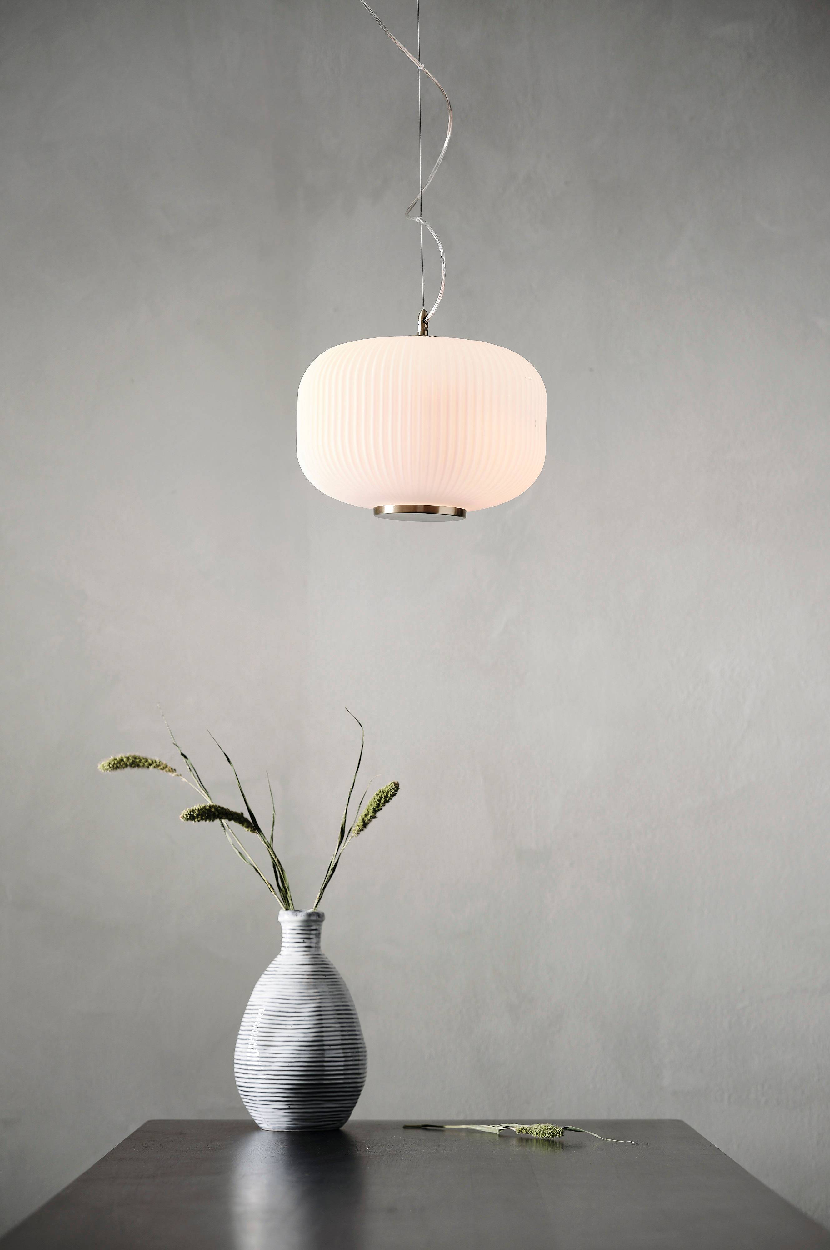 Lampa sufitowa ze szczotkowanego mosiądzu, której plisowany klosz wykonany jest z białego szkła. Ta ustawna lampa zapewnia klasyczne i ponadczasowe oświetlenie. Przezroczysty przewód o długości 1,1 m.