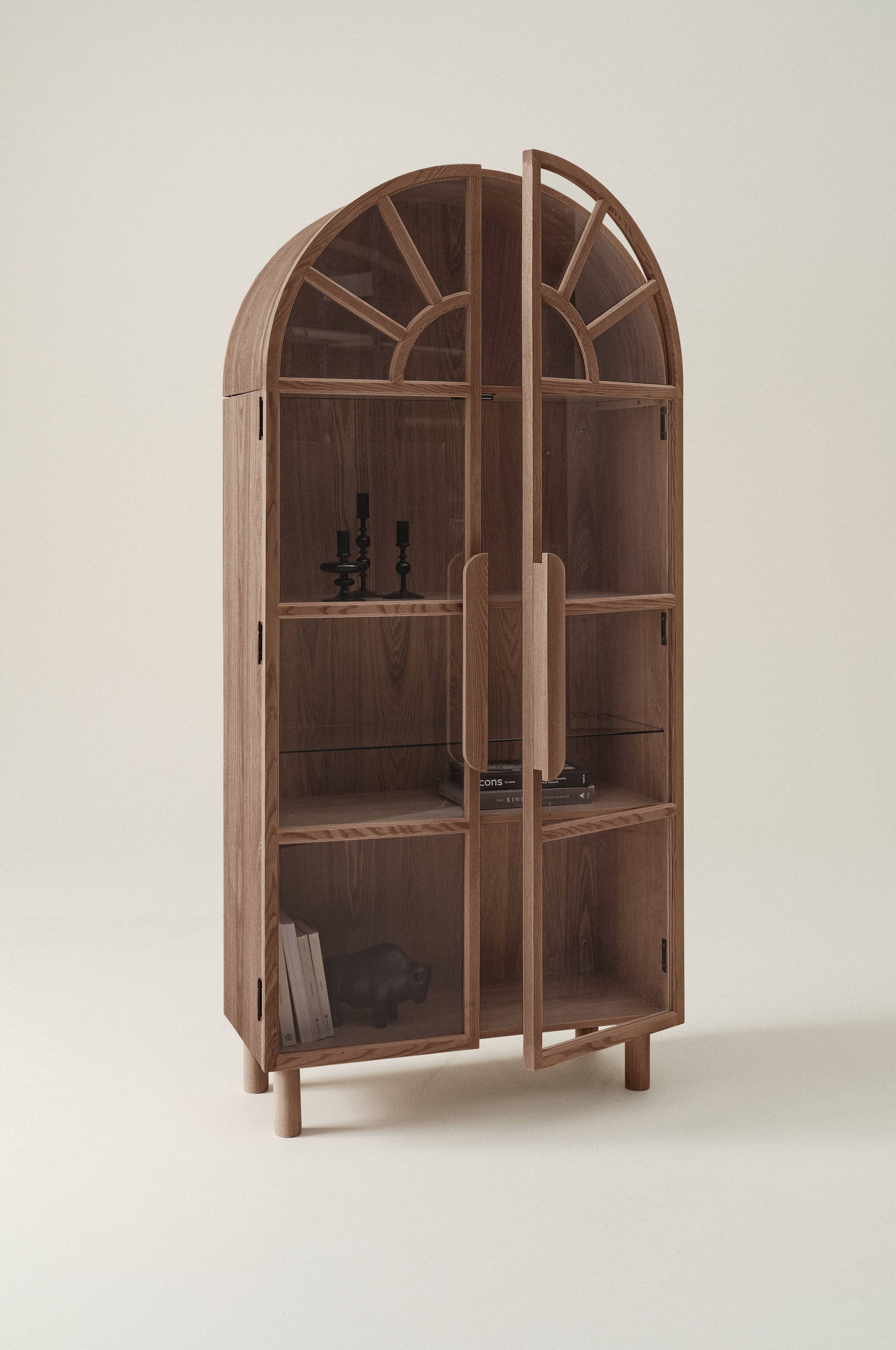 Witryna z jesionu i płyty MDF pokryta jesionowym fornirem, materiały posiadają certyfikat FSC i zostały pokryte lakierem na bazie wody. Witryna pięknie się prezentuje dzięki zaokrąglonym liniom w jej szczytowej części oraz szprysom w szklanych drzwiczkach. SANDOR to witryna, która prezentuje swoją zawartość w stylowy sposób. Łuk w górnej części, drzwiczki z uchwytem a także nóżki wykonane są z litego dębu. Ściany boczne, spód, tylna ściana oraz półki wykonane są z płyty MDF pokrytej jesionowym fornirem. W witrynie znajdują się cztery półki, trzy z płyty MDF i zostały zamontowane na stałe, jedna szklana, którą można wyjąć. Mocowanie do ściany w tylnej części witryny. Wymaga częściowego montażu. Do produktu dołączona jest instrukcja.
