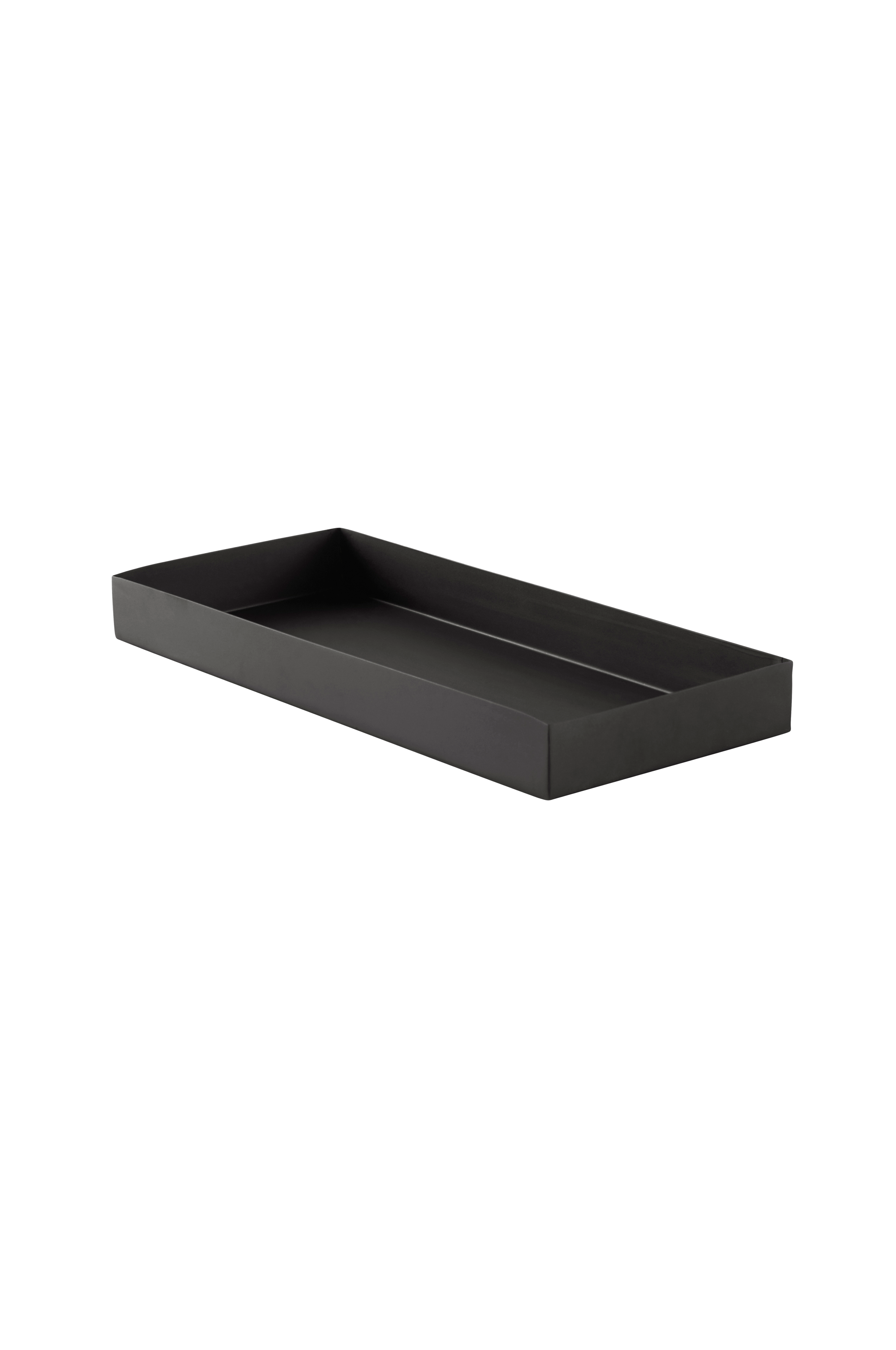 Prostokątny talerz z metalu. Niewielka burta upiększy ułożone na talerzu elementy serii SASHA. SASHA jest modną serią z matowej czarnej laki o prostych liniach, która dopełni Twoją łazienkę.