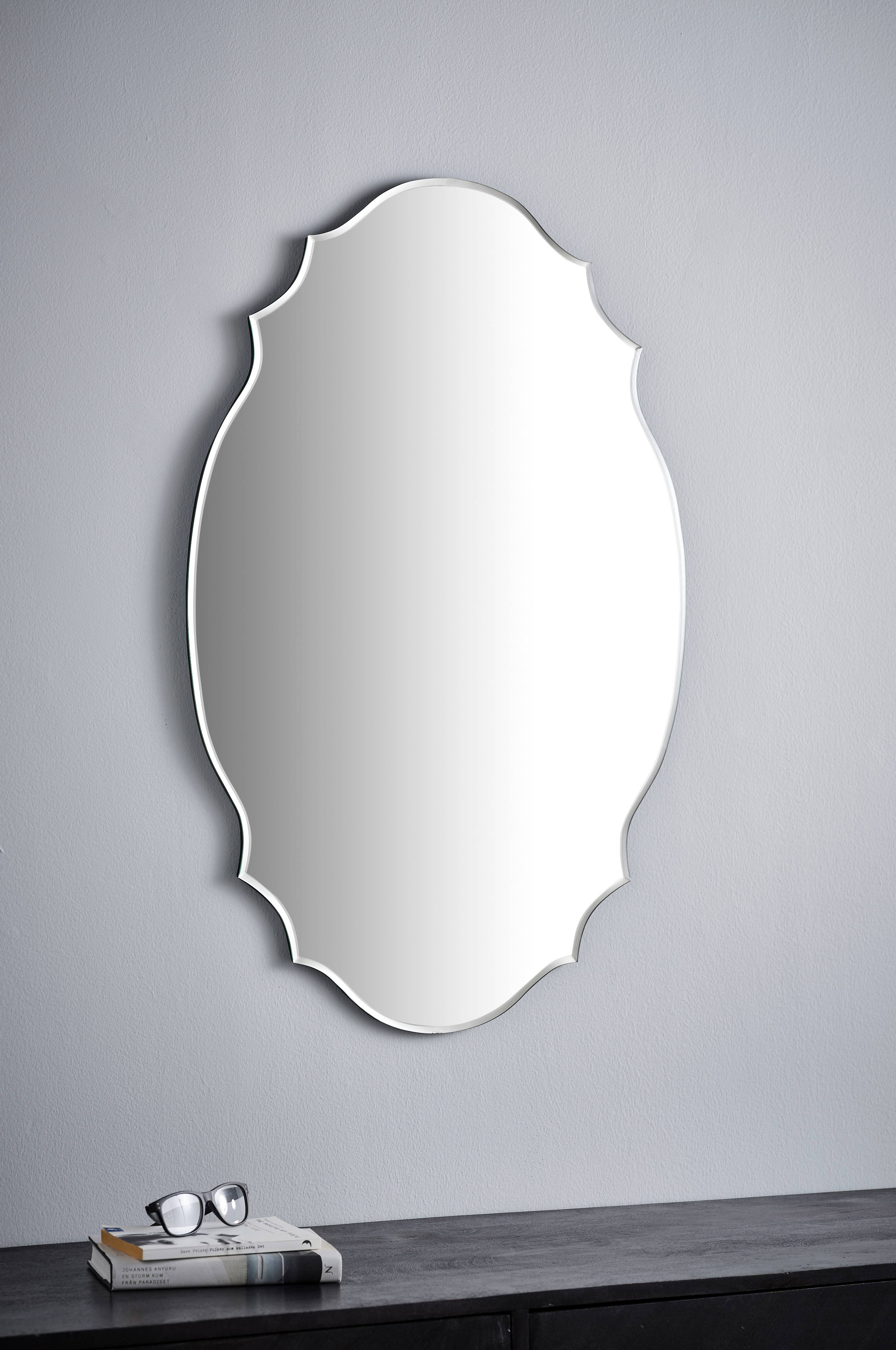 Romantyczne, lekko starodawne lustro, które kształtem i stylem przywodzi na myśl minione czasy. Lustro, z cieńką czarną obwódką wokół krawędzi, nie jest oprawione ramą. Może wisieć poziomo lub pionowo, z tyłu lustra znajdują się mocowania dla obu wariantów. Lustro to pasuje równie dobrze do łazienki i innych wilgotnych pomieszczeń.