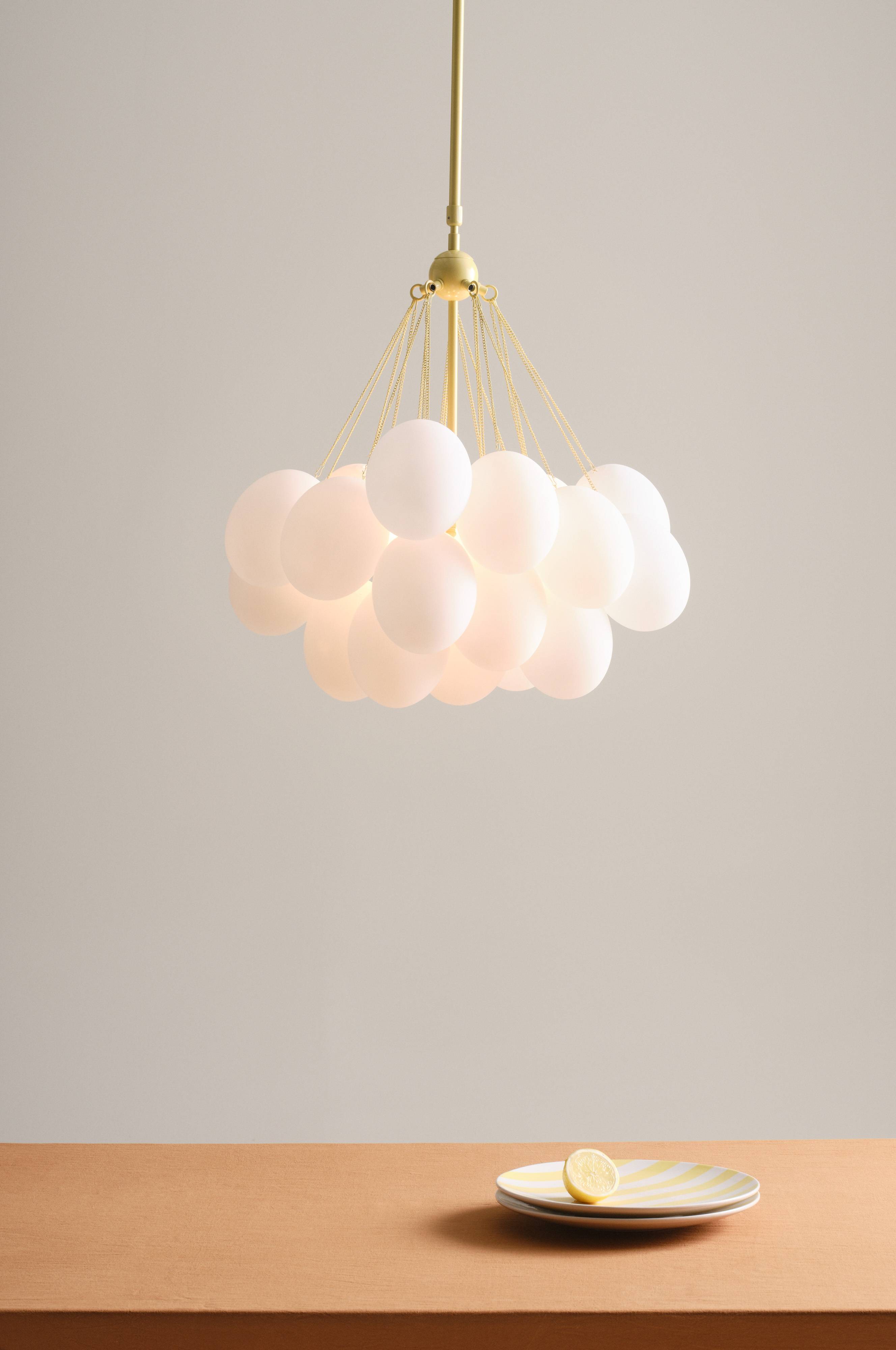 Lampa sufitowa z 21 okrągłymi kulami z opalowego szkła, w pięciu kopułach znajduje się świecznik, który sprawia, że lampa roztacza przyjemny blask. Kopuły zwisają w pięknym skupisku i tworzą wspaniałą i ekscytującą lampę sufitową, na przykład nad Twoim stołem w jadalni. Rama i kopuła sufitowa są wykonane z żelaza.