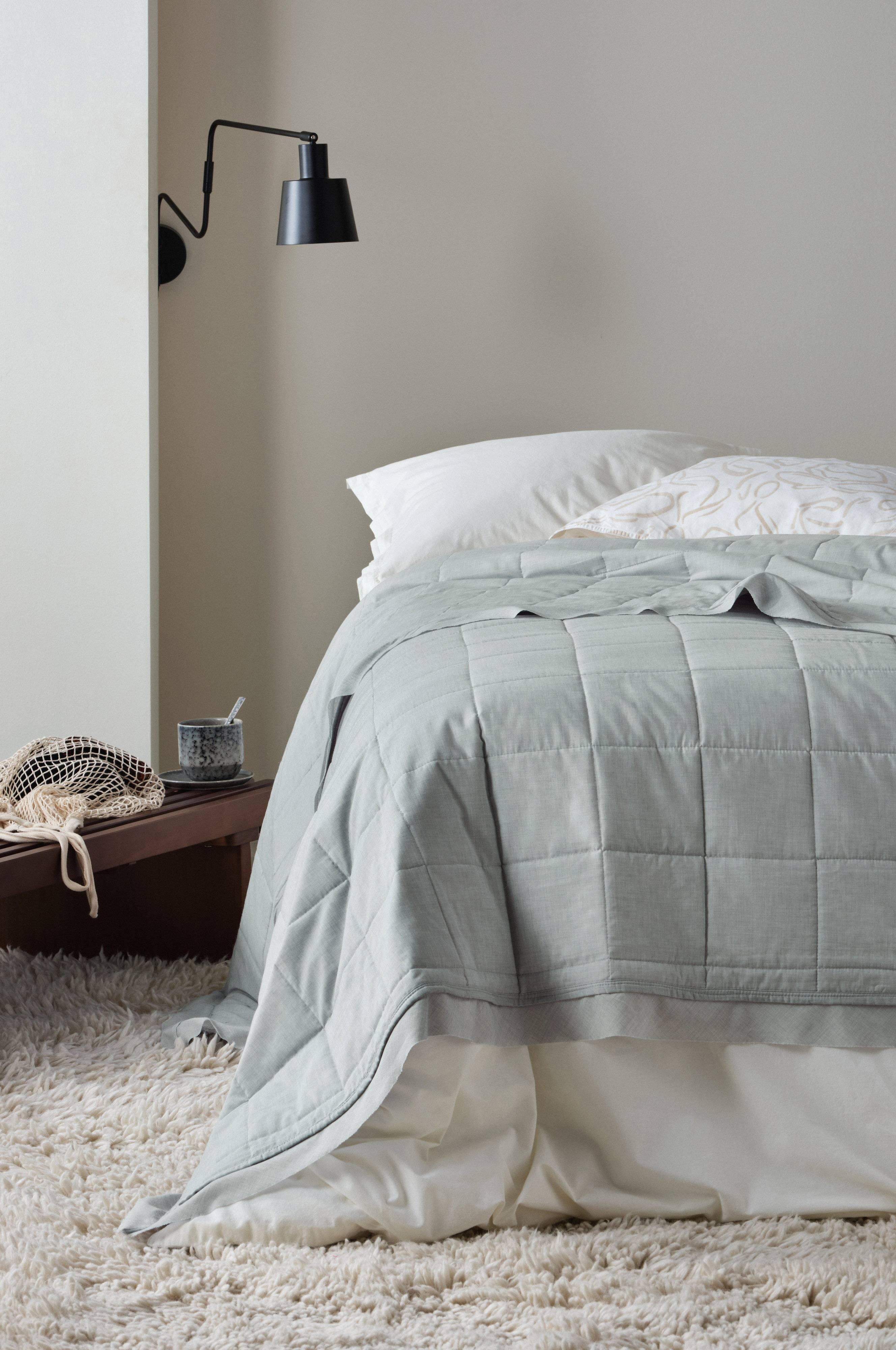 Narzuta na łóżko pojedyncze. Narzuta SENTE z bawełny i poliestru, tkanina została wykonana z barwionej przędzy, dzięki czemu produkt odznacza się miękkim i przytulnym wyglądem. Narzutę zdobi równoległe pikowanie, wypełniona jest miękkim wkładem z poliestru. Wąska, surowa lamówka wzdłuż brzegów to detal, który zapewnia narzucie szczególną oprawę. Poszewki na poduszkę nie są dołączone do zestawu - dostępne do kupienia osobno.