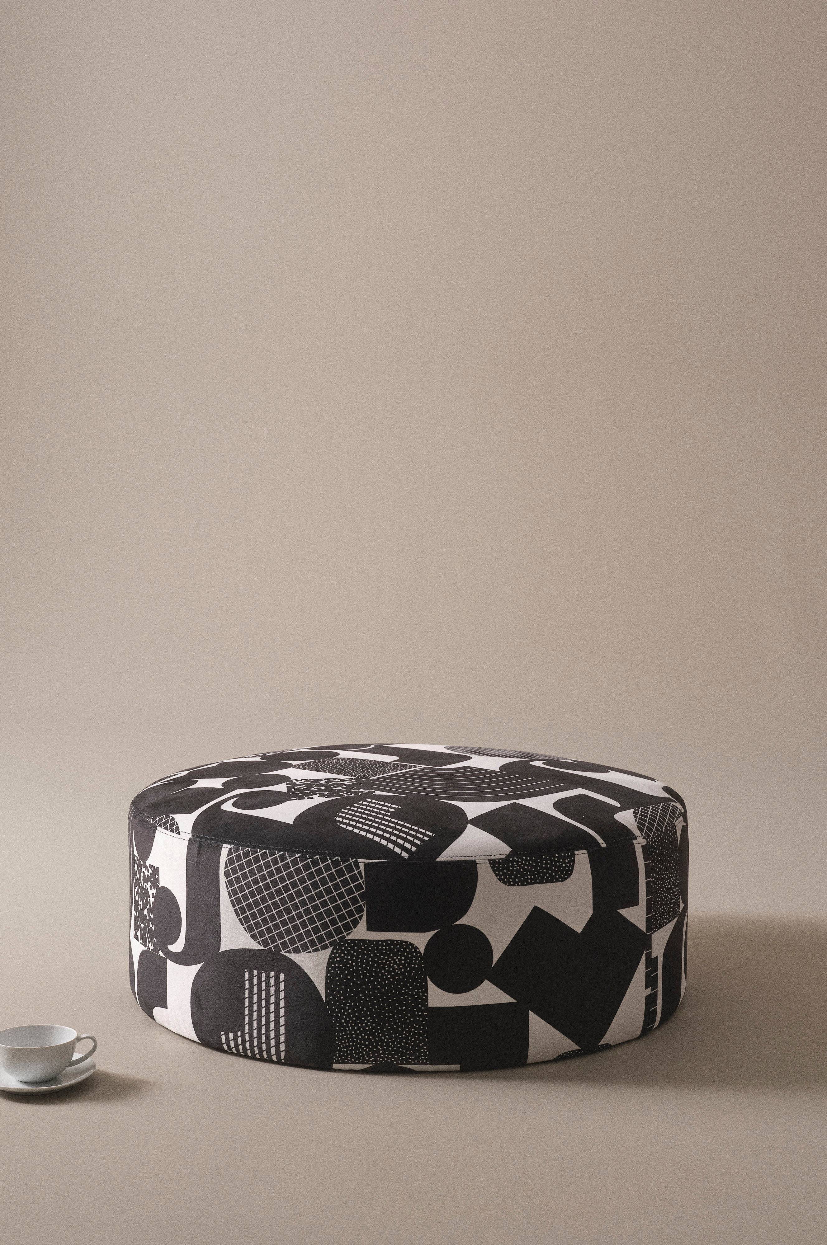 Puf do siedzenia obity w elegancki materiał z poliestru. Na tkaninie nadrukowany jest piękny wzór projektu Marii Carlberg. Ramę wykonano z drewna sosnowego z certyfikatem FSC i sklejki. Wypełnienie składa się ze sprężyn kieszonkowych, sprężyn falistych oraz pianki tapicerskiej, a całość zapewnia wysoki komfort siedzenia. Okrągły duży puf jest lekki i łatwy do przenoszenia i sprawdzi się idealnie jako oparcie dla nóg. Ponadto, posłuży jako dodatkowe miejsce do siedzenia, kiedy w domu zawitają goście.