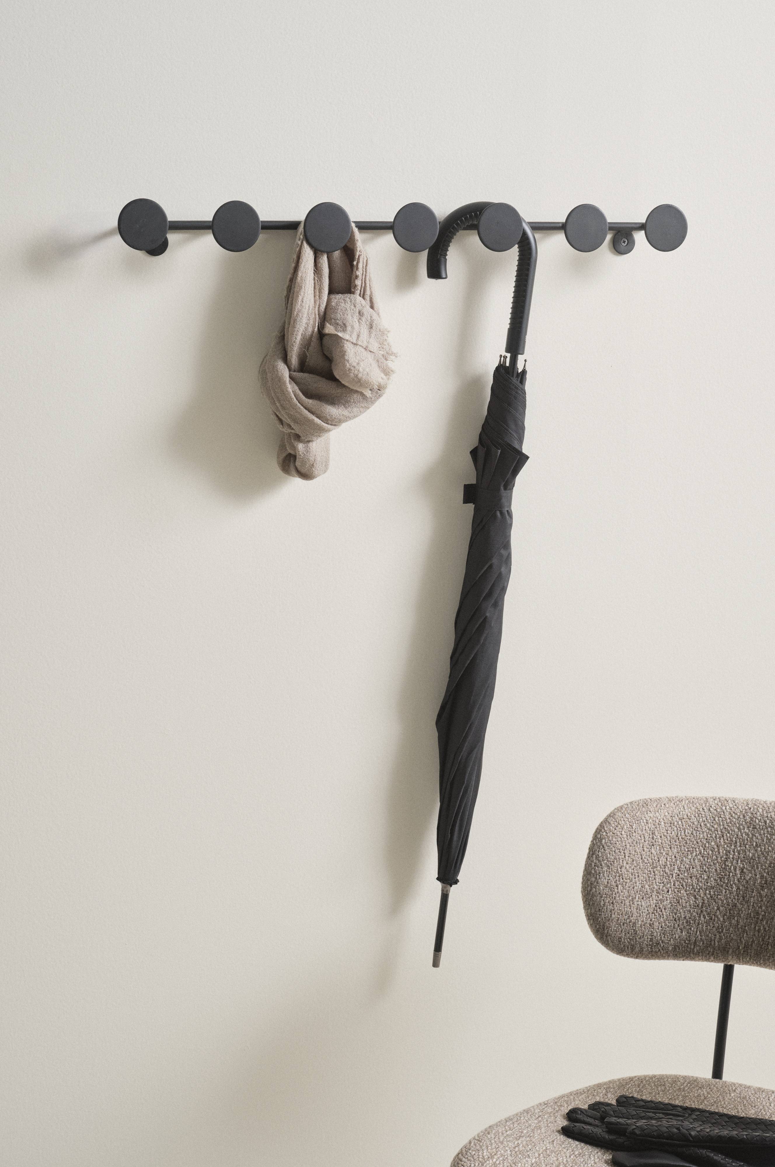 Żelazny wieszak na ubrania odznaczający się radosnym designem. Kołki biegnącego poziomo wieszaka wieńczą duże, okrągłe, płaskie plakietki. Powierzchnia została pomalowana metodą proszkową. Wieszak jest montowany na ścianie.