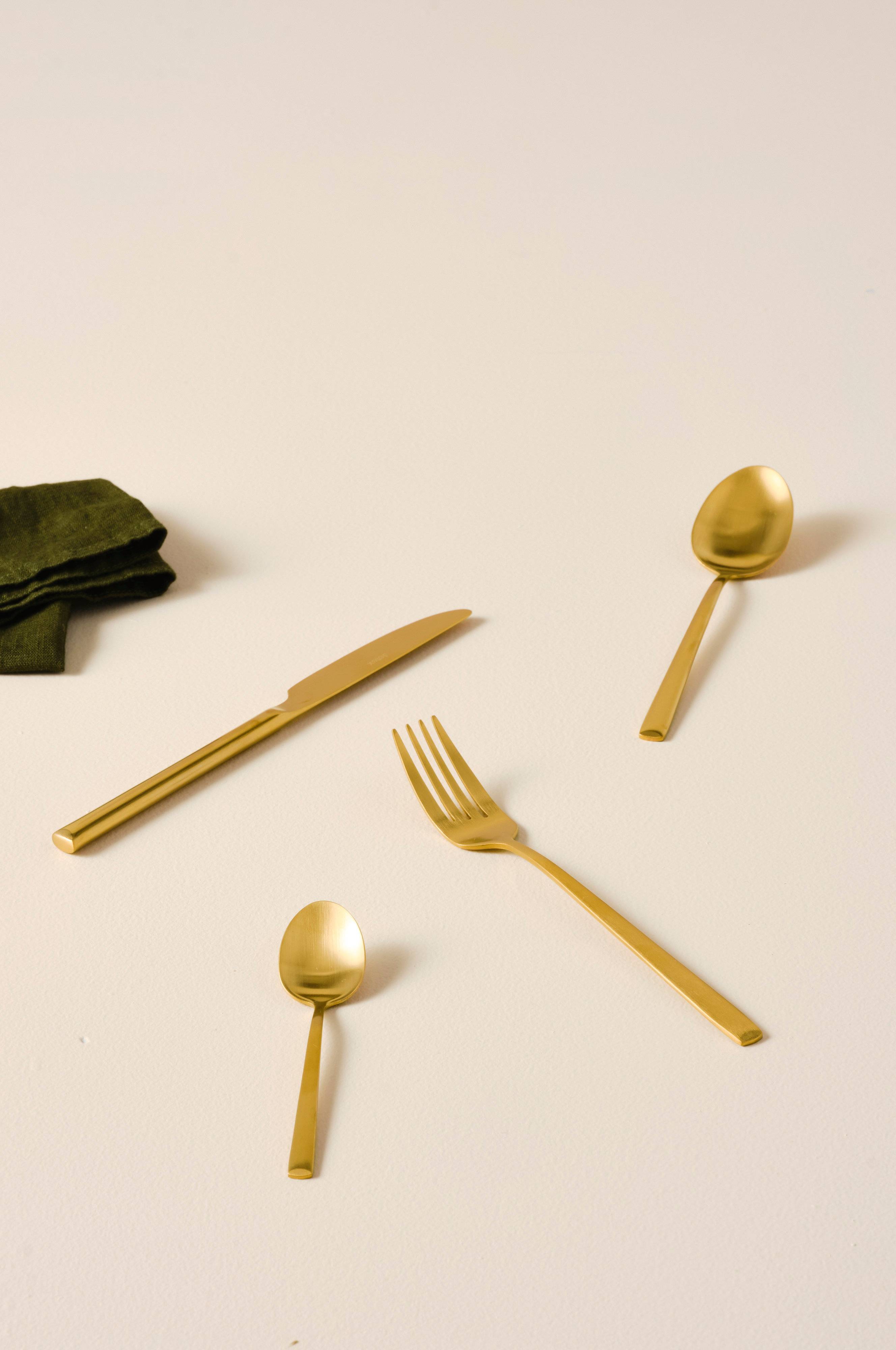 Sztućce dobrze leżą w dłoni i są schludne. Utrzymuje się dobrze i nadal ma matowy złoty wygląd