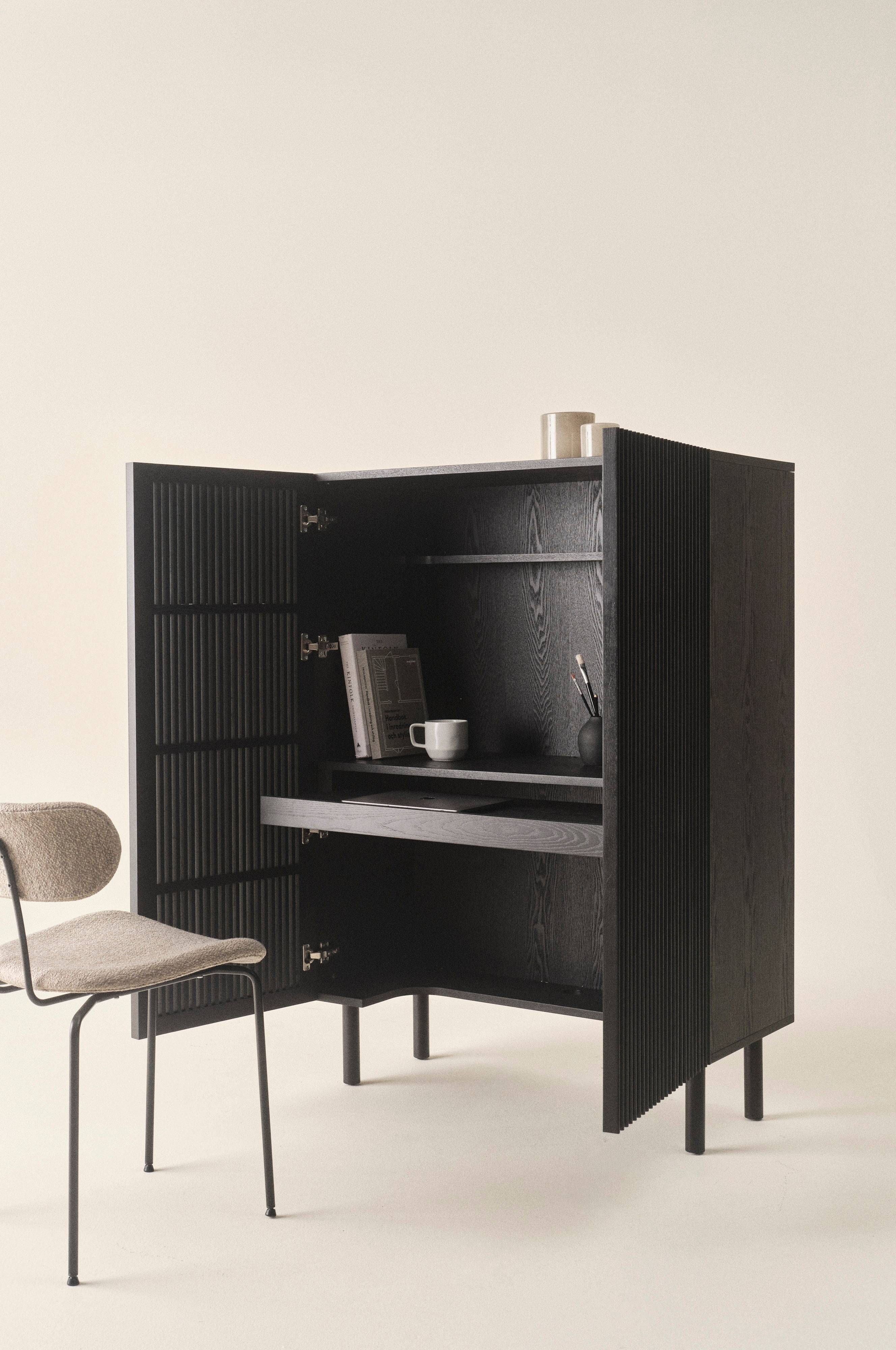 Szafka z wbudowanym biurkiem. Szafka ma drzwi i nogi z litego jesionu, ramę z płyty MDF z fornirem jesionowym. Dzięki tej szafce zyskujesz idealne domowe biuro, które ukryje komputer i akcesoria do pracy, gdy masz wolne. Za drzwiami znajduje się wysuwane biurko i specjalna półka na monitor. Półka nad monitorem pozostawia miejsce na ekran, a dolna półka ma kształt zapewniający miejsce na nogi, gdy siedzisz i pracujesz. Szafka ma naturalny skandynawski styl z nutką retro. Stylowe drzwi wykonane są z jesionowych żeber z zaokrągloną krawędzią i lekką przezroczystością w szczelinach. Proste, okrągłe nogi zapewniają schludny wygląd. Z tyłu znajdują się otwory na kable. SION pasuje równie dobrze do salonu, jak i sypialni, przedpokoju czy kuchni. Umieść szafkę tam, gdzie masz miejsce na domowe biuro. Nikt nie będzie wiedział, że jest to miejsce pracy, gdy nie pracujesz.