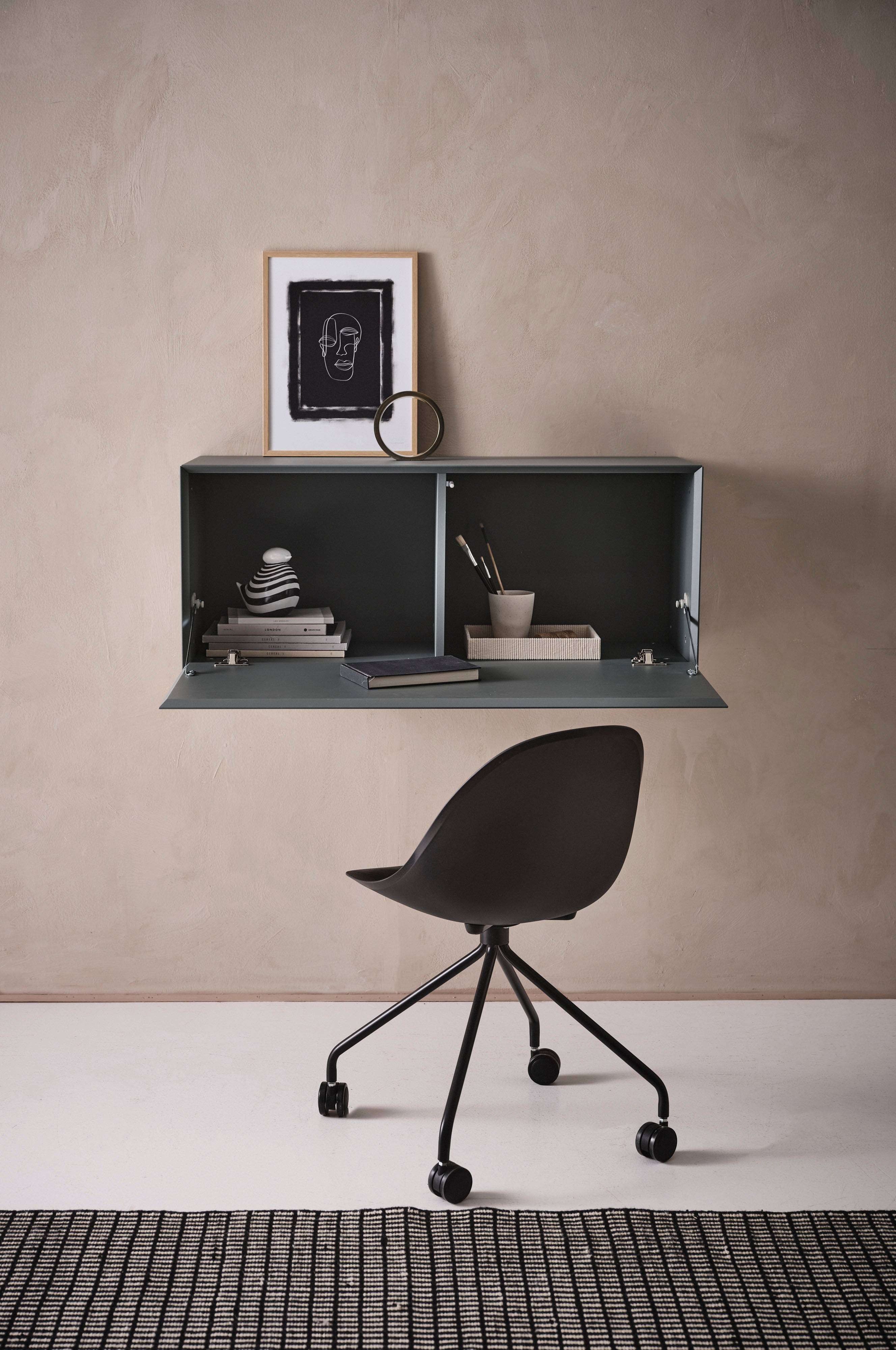 Ta szafka ma gładkie drzwi klapowe z funkcją push, co oznacza, że delikatnie popychasz drzwi do wewnątrz, aby je otworzyć i zamknąć. Drzwiczki mają solidne uchwyty na klapę i delikatnie fazowaną krawędź od wewnątrz, co jest detalem, który je uwydatnia. Szafka nie ma nóżek i jest montowana na ścianie na żądanej wysokości, co daje stylowy i efektowny rezultat. Można ją również zamontować jako biurko, dzięki czemu uzyskasz stylowe miejsce pracy w swoim domowym biurze. Listwa do zawieszania w zestawie, śruby i kołki nie są dołączone.