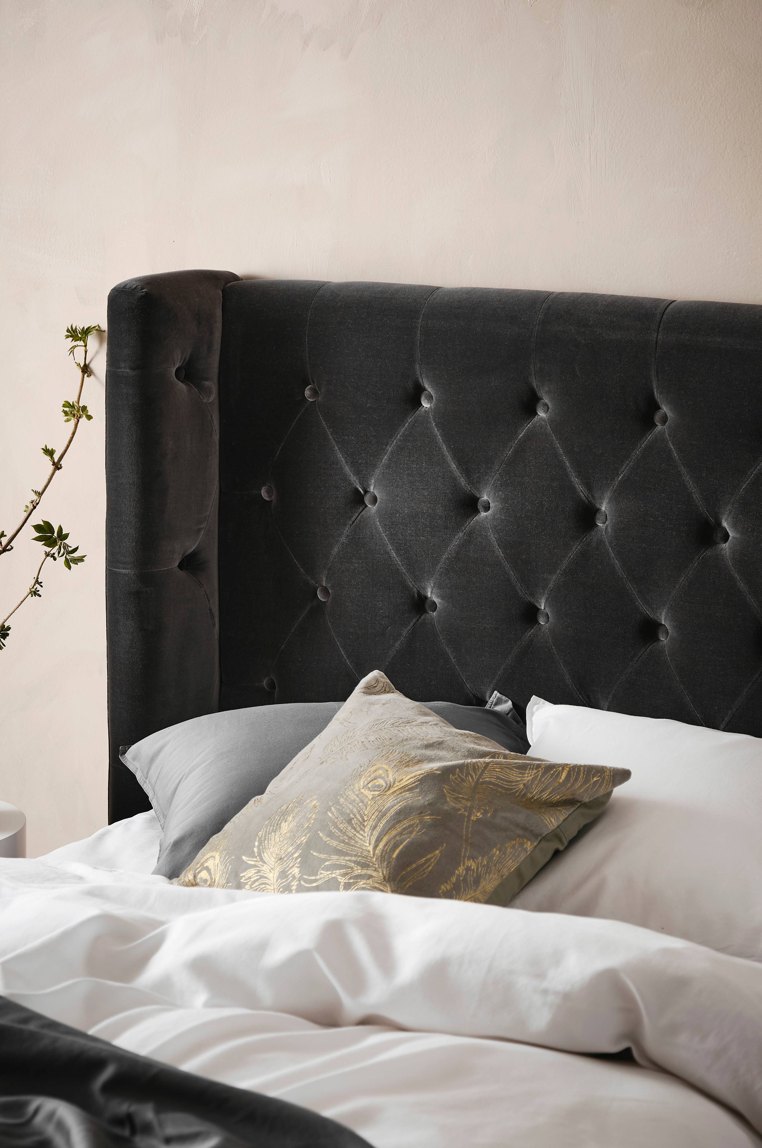 Wolnostojący szczyt łóżka z obiciem z aksamitu pikowanym powleczonymi guzikami. Nadaje się również do zamontowania na ścianie. Stworzysz w domu atmosferę hotelowego luksusu za pomocą pikowanego szczytu łóżka ze skrzydłami. Tapicerka wykonana w całości z najlepszego aksamitu z mieszanki bawełny.