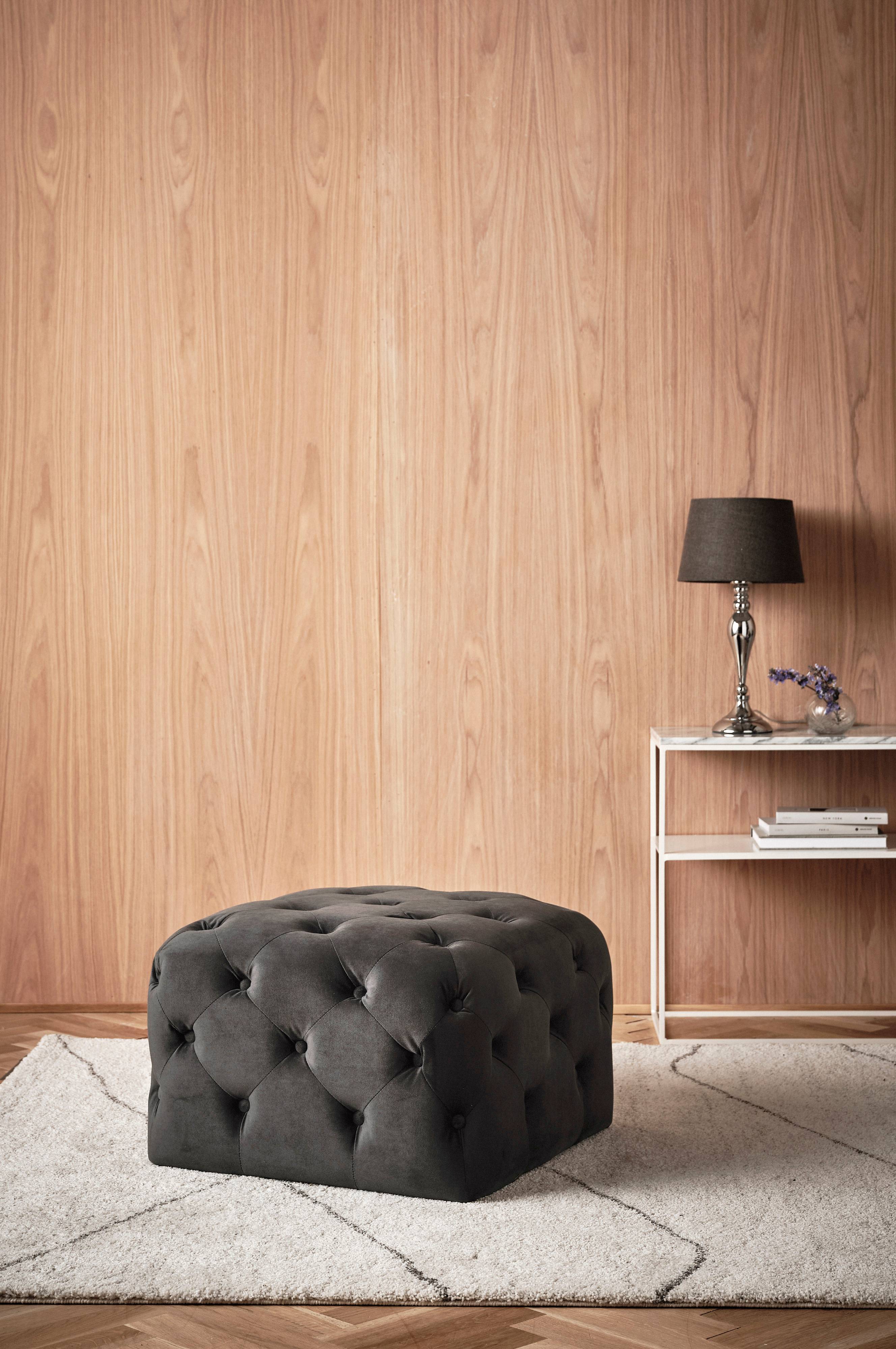 Kwadratowy puf do siedzenia z aksamitnym obiciem pikowanym powleczonym guzikami. Połączenie sprężyn falistych, zespołu sprężyn kieszonkowych i gumy piankowej zapewnia najwyższy komfort siedzenia. Puf przyda się doskonale, gdy pojawi się dużo gości. Obicie pufa zszyte jest z małych kawałków materiału, a dzięki temu, że aksamit to materiał z bardzo krótką okrywą włosową, w zależności od tego, jak pada światło, zszyte ze sobą kawałki zawsze będą się od siebie różnić. Nadaje to pufowi ożywiony wygląd. Materiał ma wytrzymałość 28 000 cykli Martindale'a.