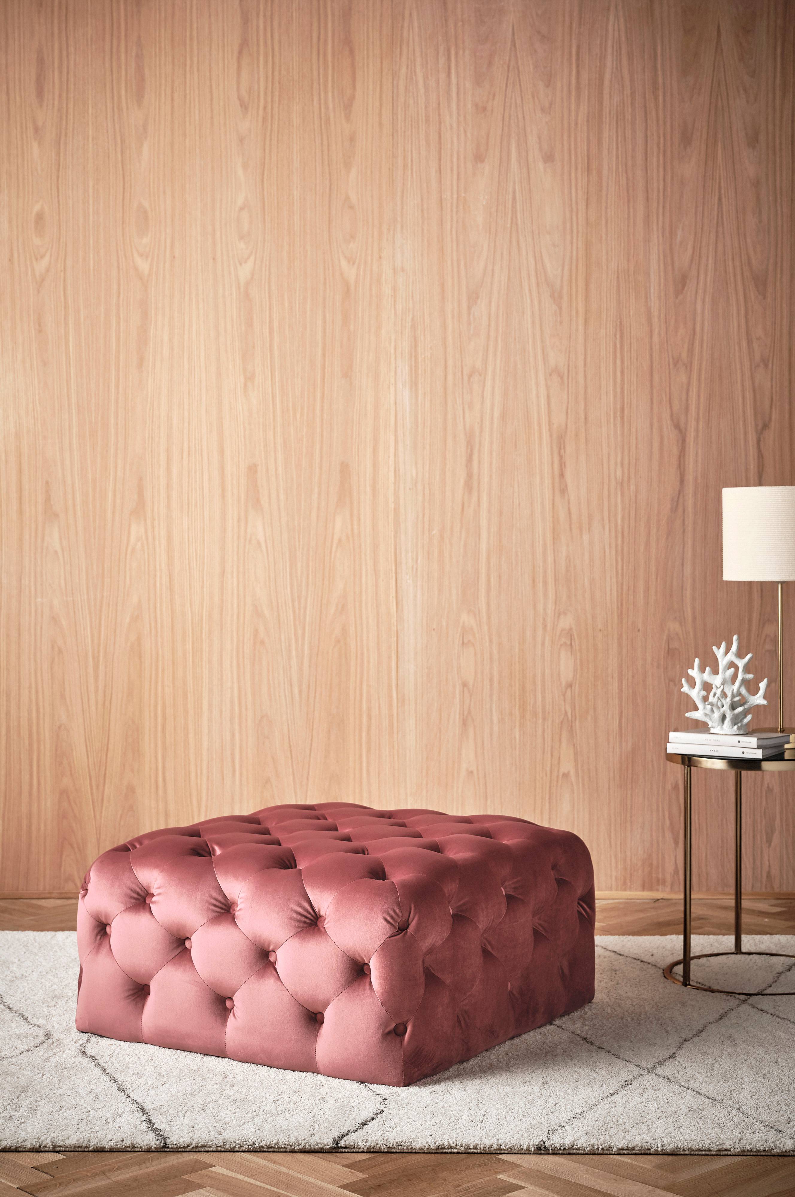 Kwadratowy puf do siedzenia z aksamitnym obiciem pikowanym powleczonym guzikami. Połączenie sprężyn falistych, zespołu sprężyn kieszonkowych i gumy piankowej zapewnia najwyższy komfort siedzenia. Puf przyda się doskonale, gdy pojawi się dużo gości. Obicie pufa zszyte jest z małych kawałków materiału, a dzięki temu, że aksamit to materiał z bardzo krótką okrywą włosową, w zależności od tego, jak pada światło, zszyte ze sobą kawałki zawsze będą się od siebie różnić. Nadaje to pufowi ożywiony wygląd. Materiał ma wytrzymałość 28 000 cykli Martindale'a.