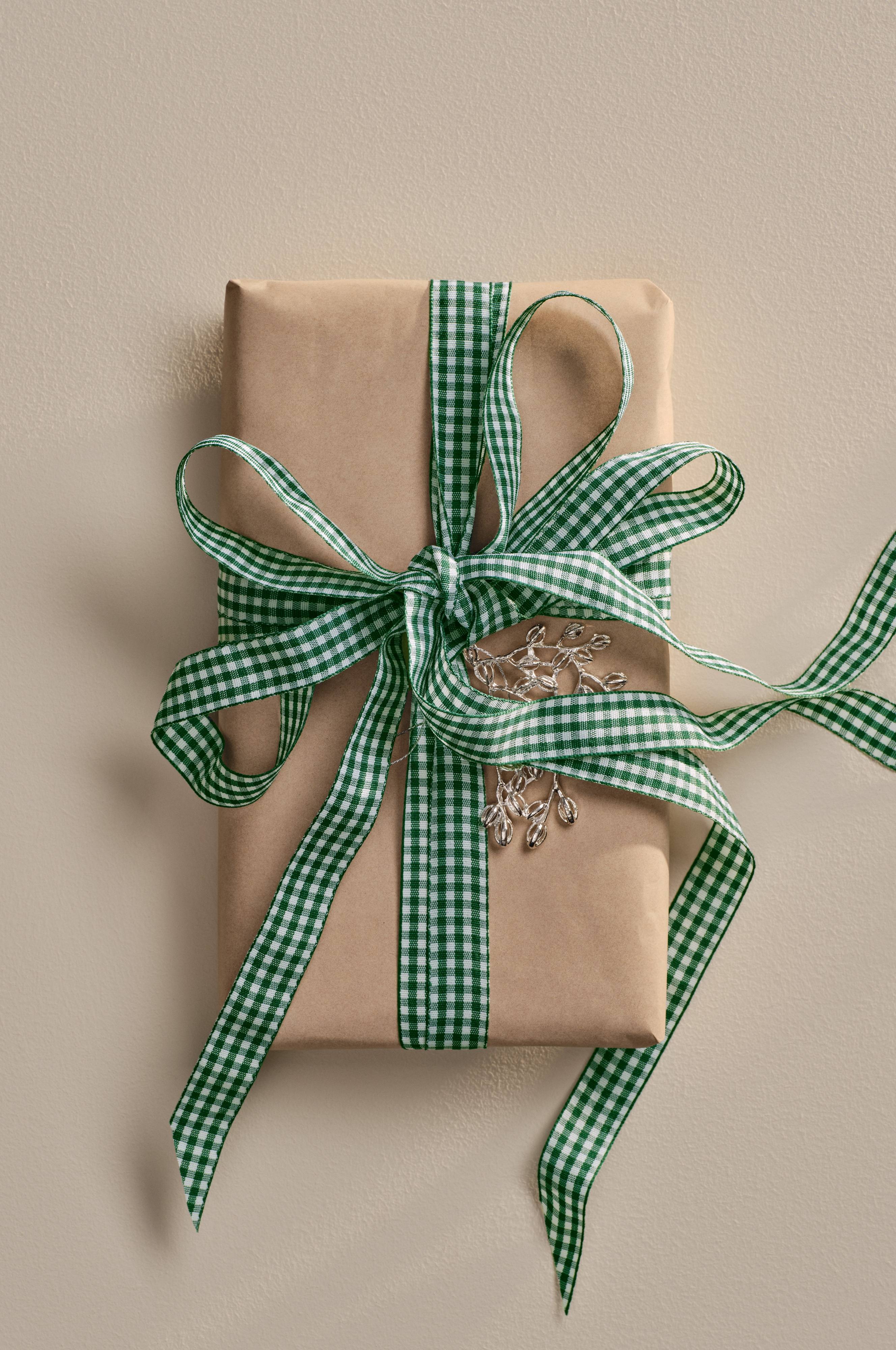 Wstążka do pakowania prezentów z małym wzorem w kratkę, idealna do dodania świątecznego akcentu do prezentów. Idealny do tworzenia pięknie zapakowanych prezentów, które wyróżniają się pod choinką.