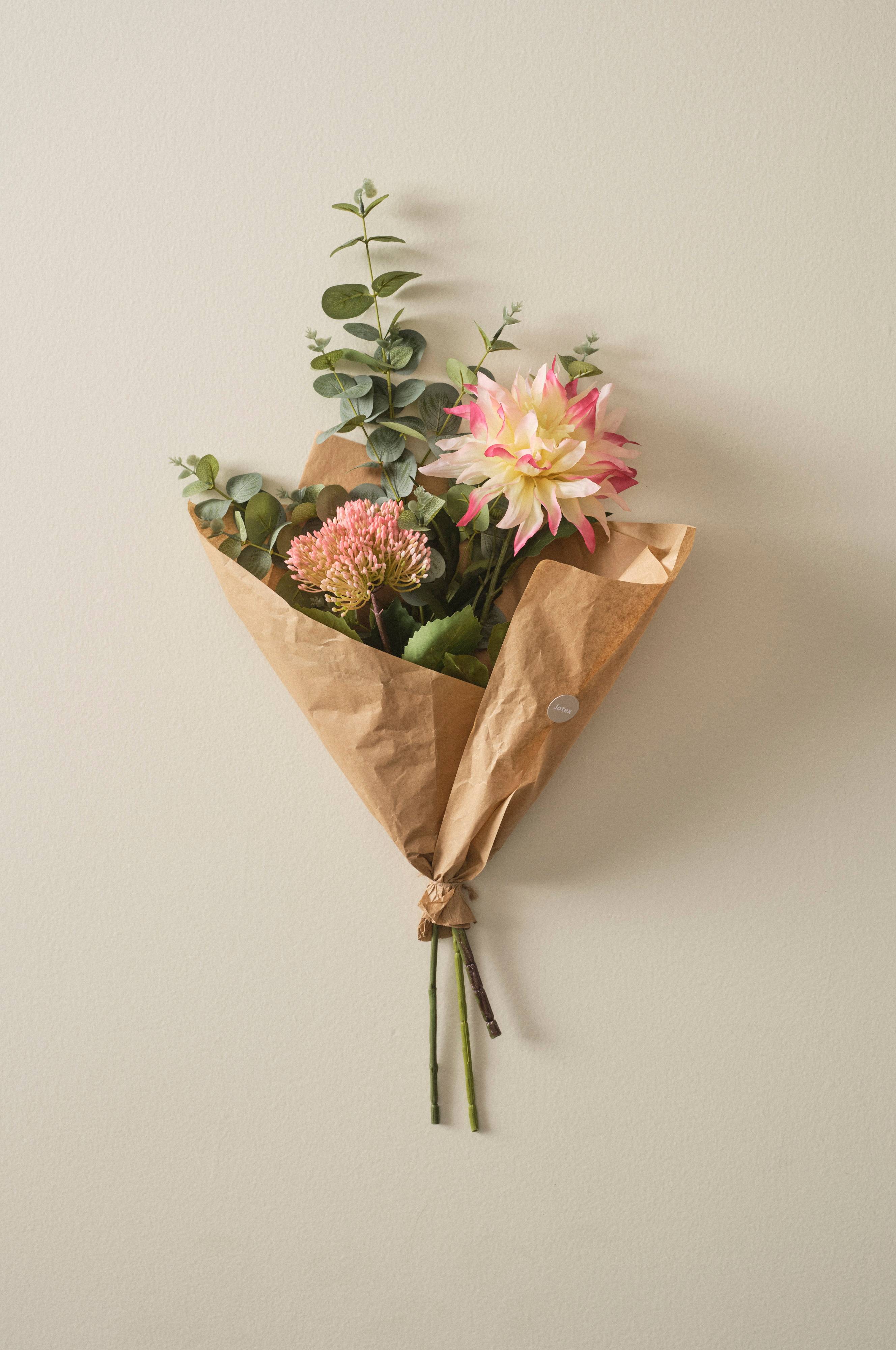 Sztuczny bukiet kwiatów składający się z dalii, rozchodnika i eukaliptusa. Każdy bukiet jest wiązany ręcznie. Bukiet wygląda niezwykle naturalnie i w 70% został wykonany z poliestru pochodzącego z recyklingu. Bukiet jest zawinięty w bibułę. Artystycznie ułożony bukiet będzie cieszyć oko przez długi czas i nigdy nie zwiędnie.