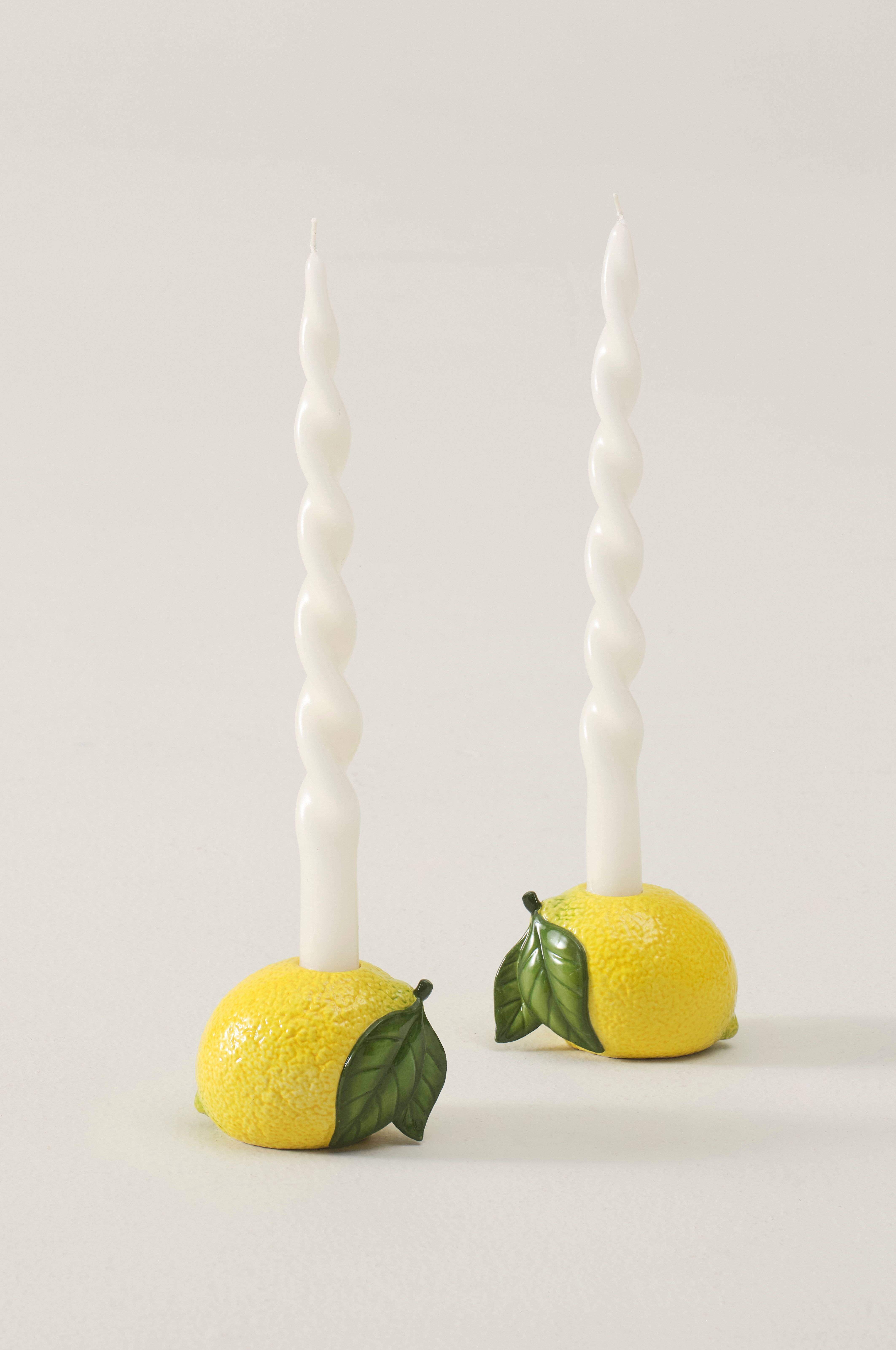 Zestaw świeczników SOUR wniesie pikantny urok do każdego pomieszczenia. Wykonana z porcelany dolomitowej para świeczników o tematyce cytrynowej jest ręcznie wykonana, dzięki czemu każdy egzemplarz jest wyjątkowy. Należące do serii SOUR świeczniki idealnie pasują do innych przedmiotów, zapewniając spójny wygląd w Twoim domu. Idealne dla tych, którzy cenią sobie wyjątkowość i odrobinę piękna inspirowanego naturą.