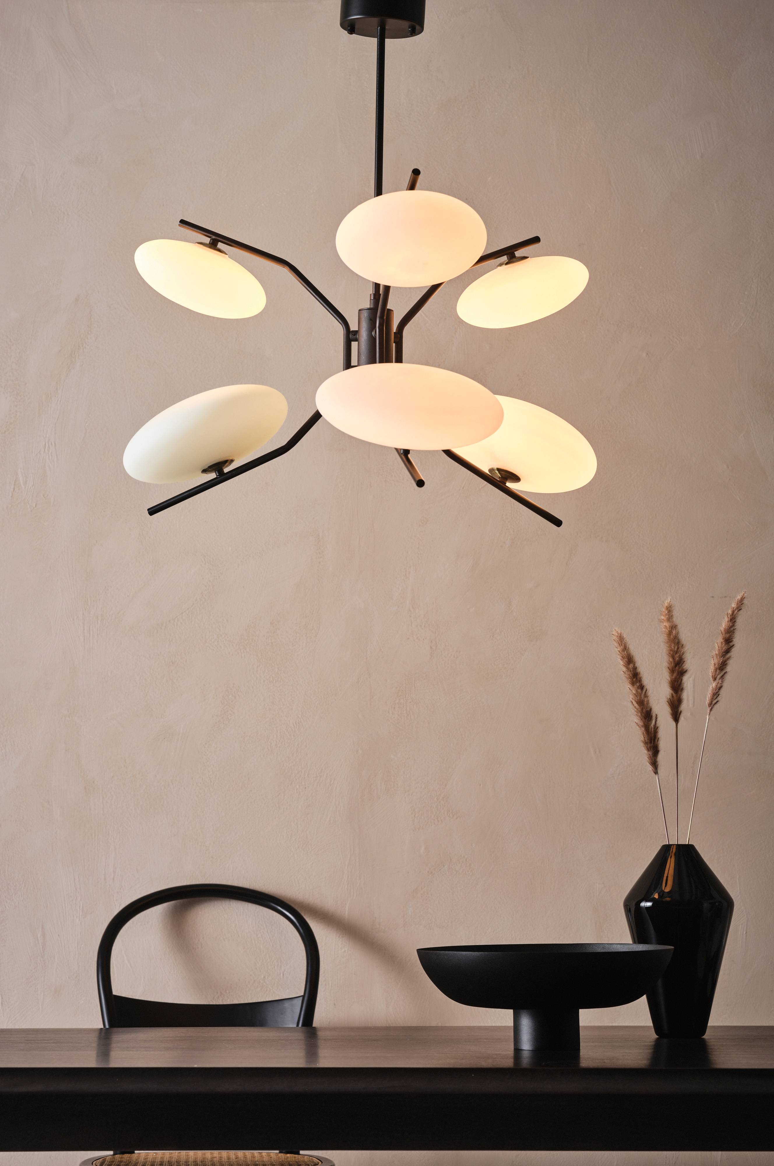 Lampa sufitowa z metalu, która składa się z sześciu punktów świetlnych w kształcie owalnych kloszy wykonanych z opalowego szkła, klosze umieszczone wyżej są odrobinę mniejsze od tych znajdujących się niżej. Powieszona nad stołem SPHERE nie tylko zapewni dobre oświetlenie, lecz również przyciągnie wzrok i nada pomieszczeniu wyjątkowy charakter, nawet wtedy, kiedy nie będzie włączona. Lampa jest uziemiona. Wtyk nie wchodzi w skład zestawu ze względu na nowe regulacje unijne. Produkt o nazwie ROOF EARTH, wtyk sufitowy, dostępny jest osobno.