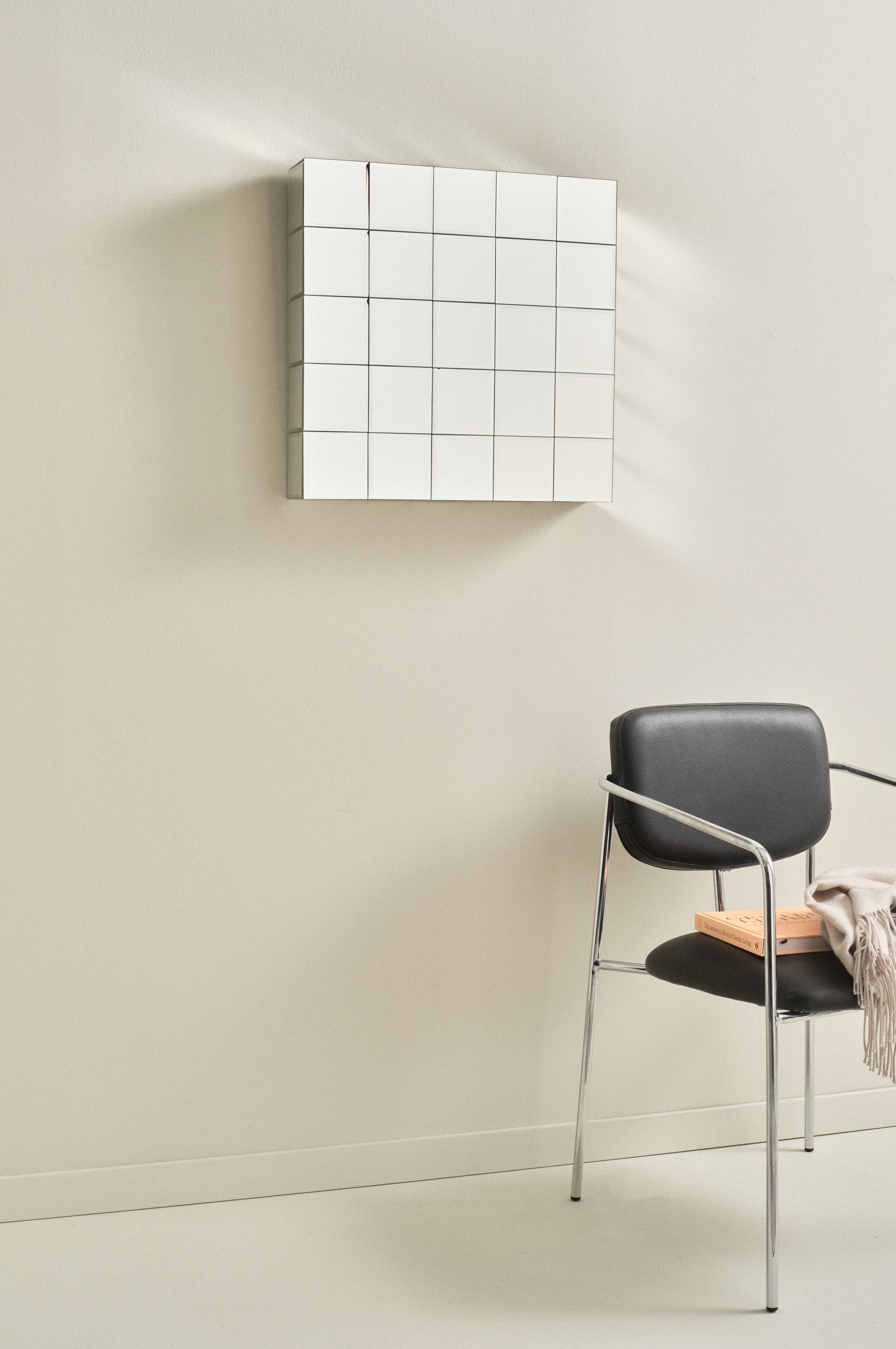 Kwadratowe lustro o intrygującym kształcie. Lustro składa się z wielu mniejszych lusterek o fasetkowo ściętych bokach. Każde mniejsze lusterko ma wymiary 10x10 cm, a ponieważ lusterka pokrywają także boki lustra, odstaje ono nieco od ściany. Rama wykonana jest z płyty MDF oznaczonej certyfikatem FSC. Z tyłu dwa metalowe oczka do zawieszenia.