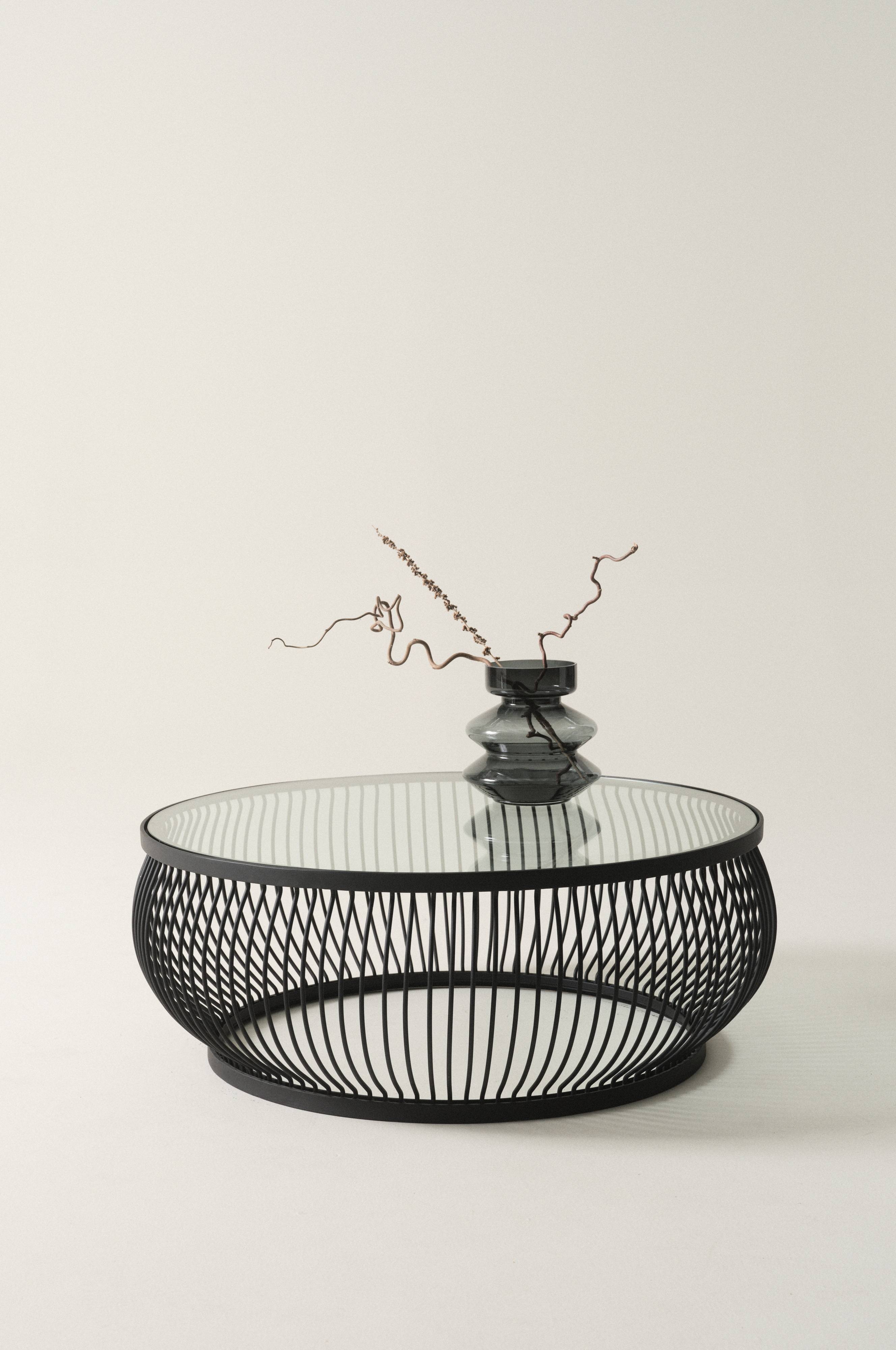 Okrągły stolik z charakterem. Stolik ma miękki kształt, który kontrastuje ze szklanym blatem i metalową ramą. Wykonany z przejrzystego szkła blat dekoracyjnie odbija światło, podkreślając w ten sposób wykonaną z wąskich, metalowych prętów ramę.
