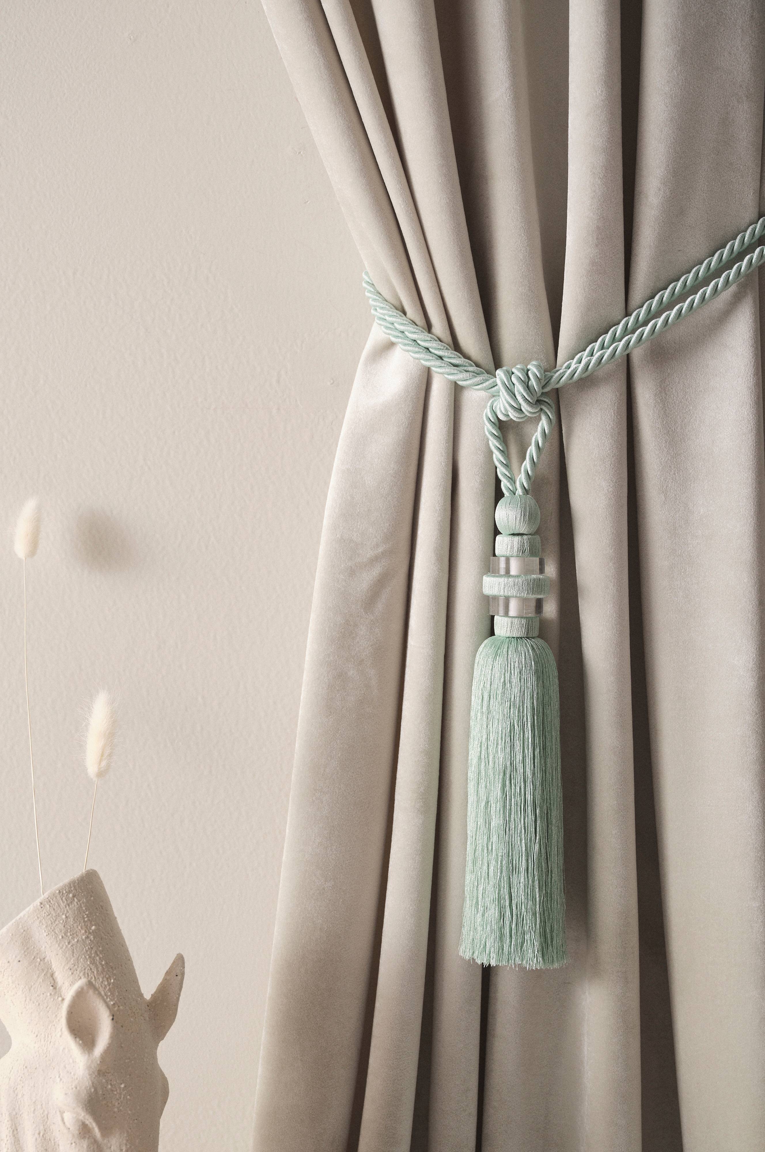 Dwie opaski z wiskozy i akrylu. SUKI to stylowe opaski z ozdobnymi koralikami, dzięki którym w połączeniu z zasłonami stworzysz ciekawą aranżację wnętrza.