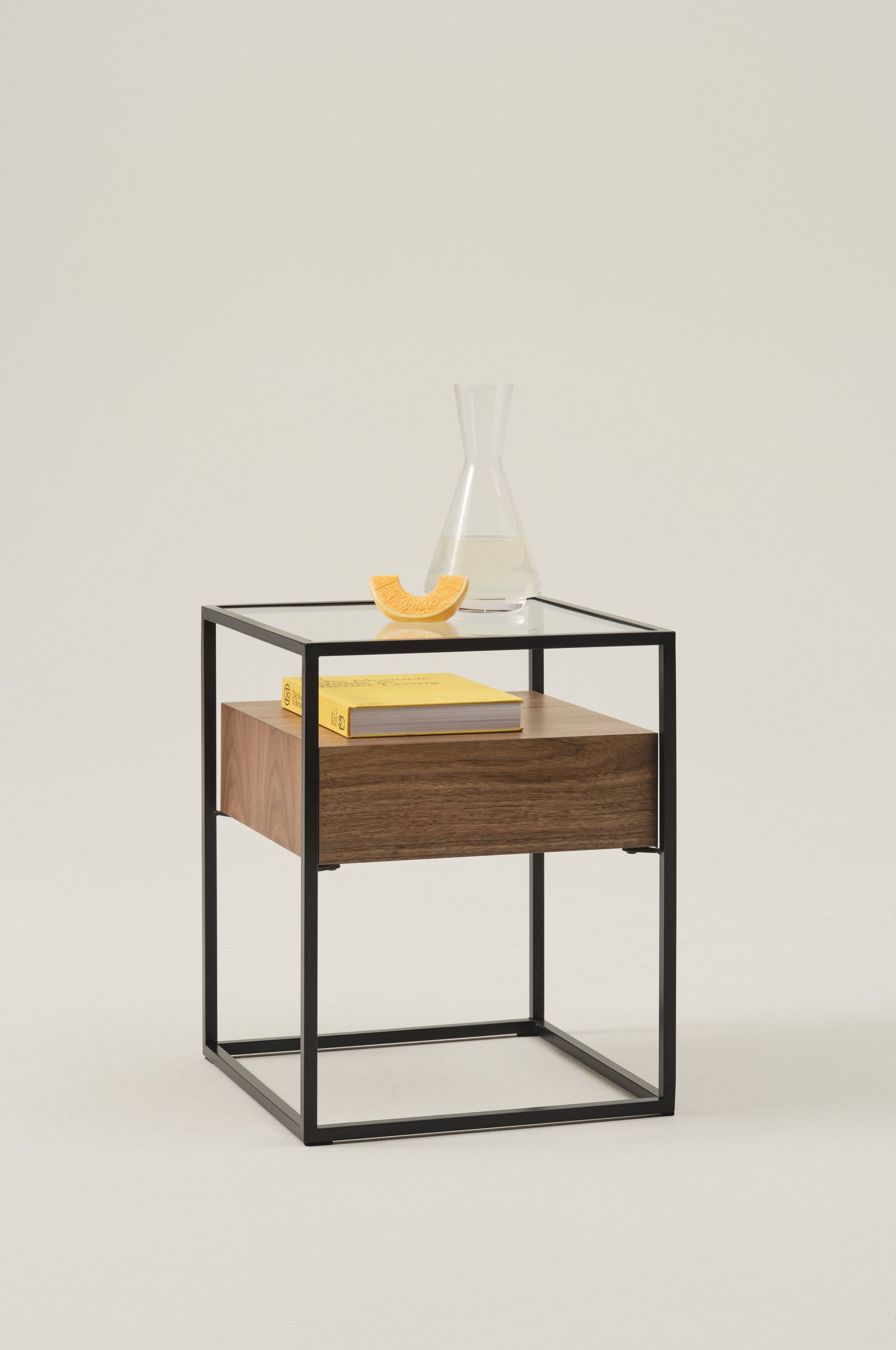 Kwadratowy stolik salonowy na metalowej ramie z blatem z przeźroczystego szkła oraz szufladą wykonaną z płyty MDF pokrytej fornirem. Nowoczesny stolik z ukrytą szufladą, której łatwe otweranie zapewnia odpowiednio wyprofilowany spodni kant.
