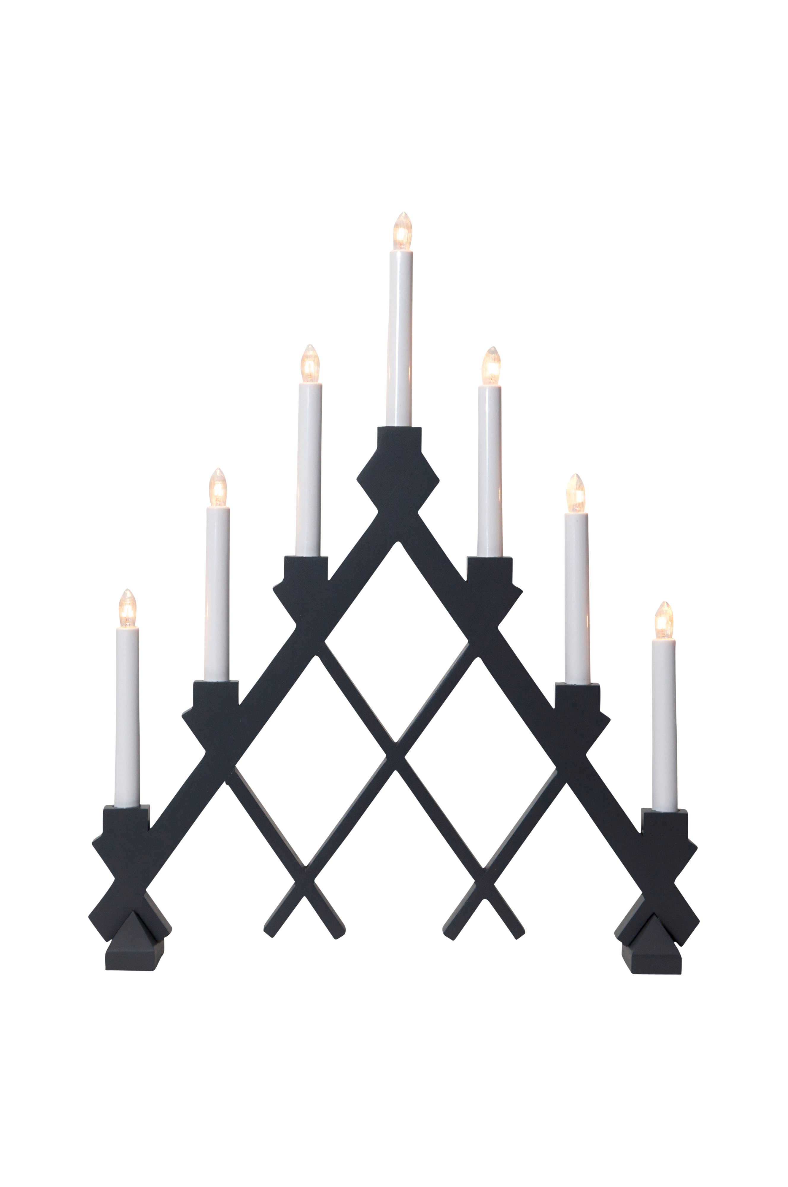 Piękny, drewniany świecznik stylowym szarym kolorze. Piękny wzór kraty przyciąga wzrok. Dzięki świecom, świecznik roztacza przytulny blask. Wysokość 53 cm, szerokość 43 cm, głębokość 7 cm. Gwint E10. Długość przewodu 180 cm.