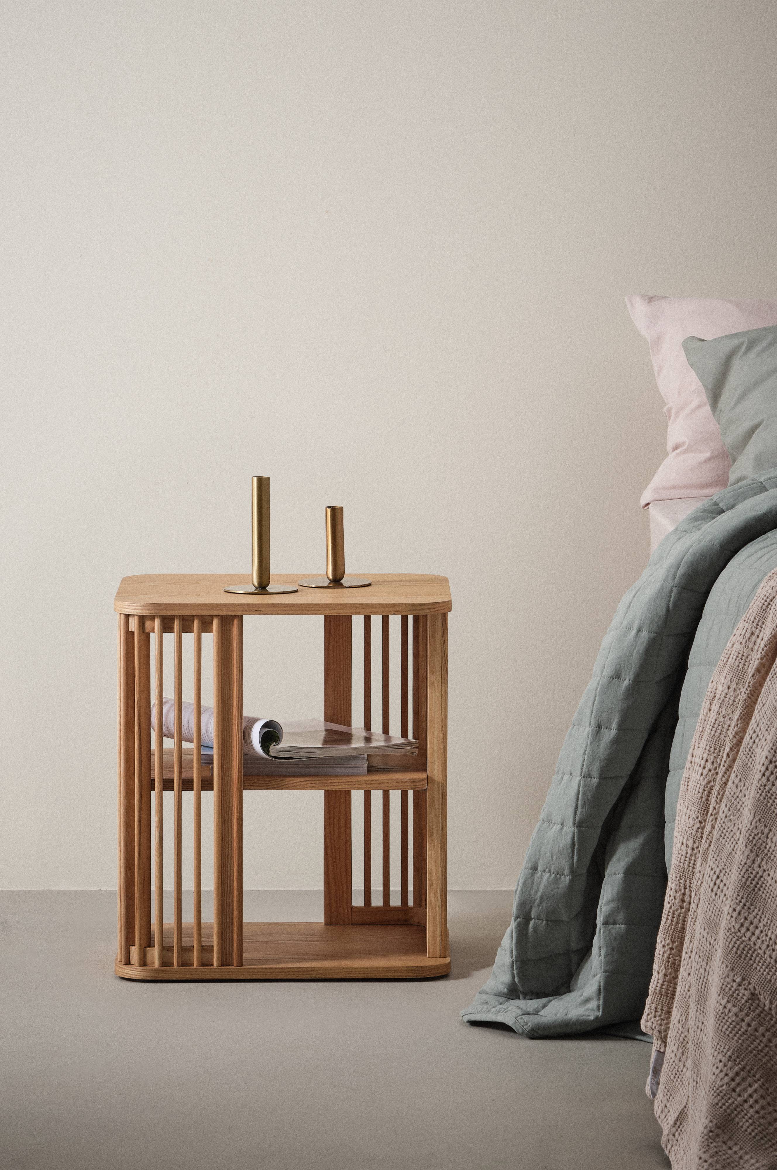 TARIV to uroczy stolik nocny z drewna z certyfikatem FSC, zapewniający mnóstwo miejsca na książki i inne drobiazgi, które chcesz mieć przy łóżku. Prostokątny stolik ma miękko zaokrąglone rogi, a jego boki tworzą wąskie listewki z litego jesionu. Podstawa, półka i blat zostały wykonane z MDF pokrytego jesionowym fornirem. Stolik został pokryty bejcą.