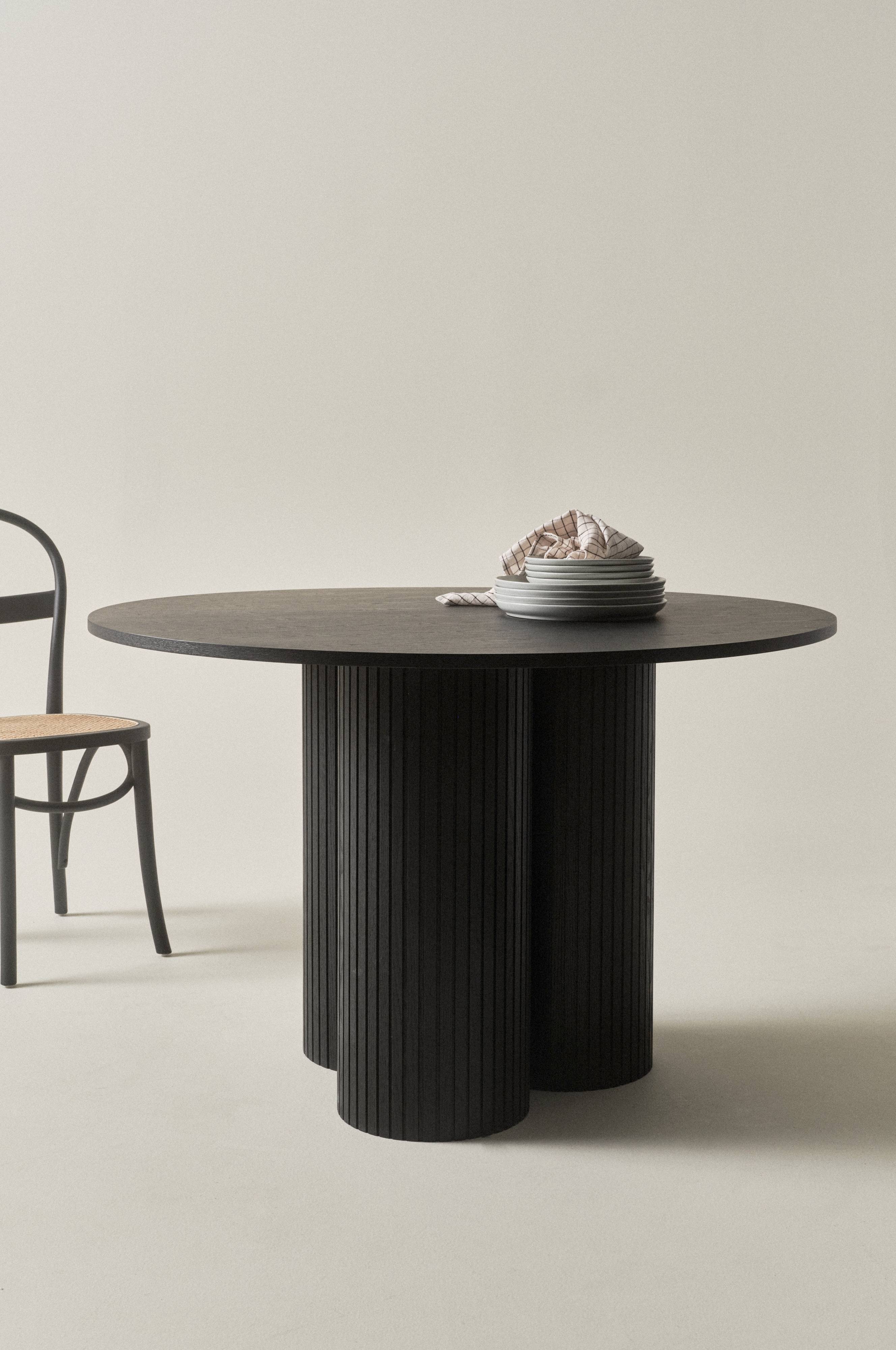 Okrągły stół wykonany z posiadającej certyfikat FSC płyty MDF pokrytej okleiną o malowanym wykończeniu. Stół ma nowoczesną formę z jedną, solidną nogą umieszczoną pośrodku. Noga składa się z trzech okrągłych „filarów" ozdobionych strukturą pionowych pasków. Wymaga częściowego montażu. Do produktu dołączona jest instrukcja.