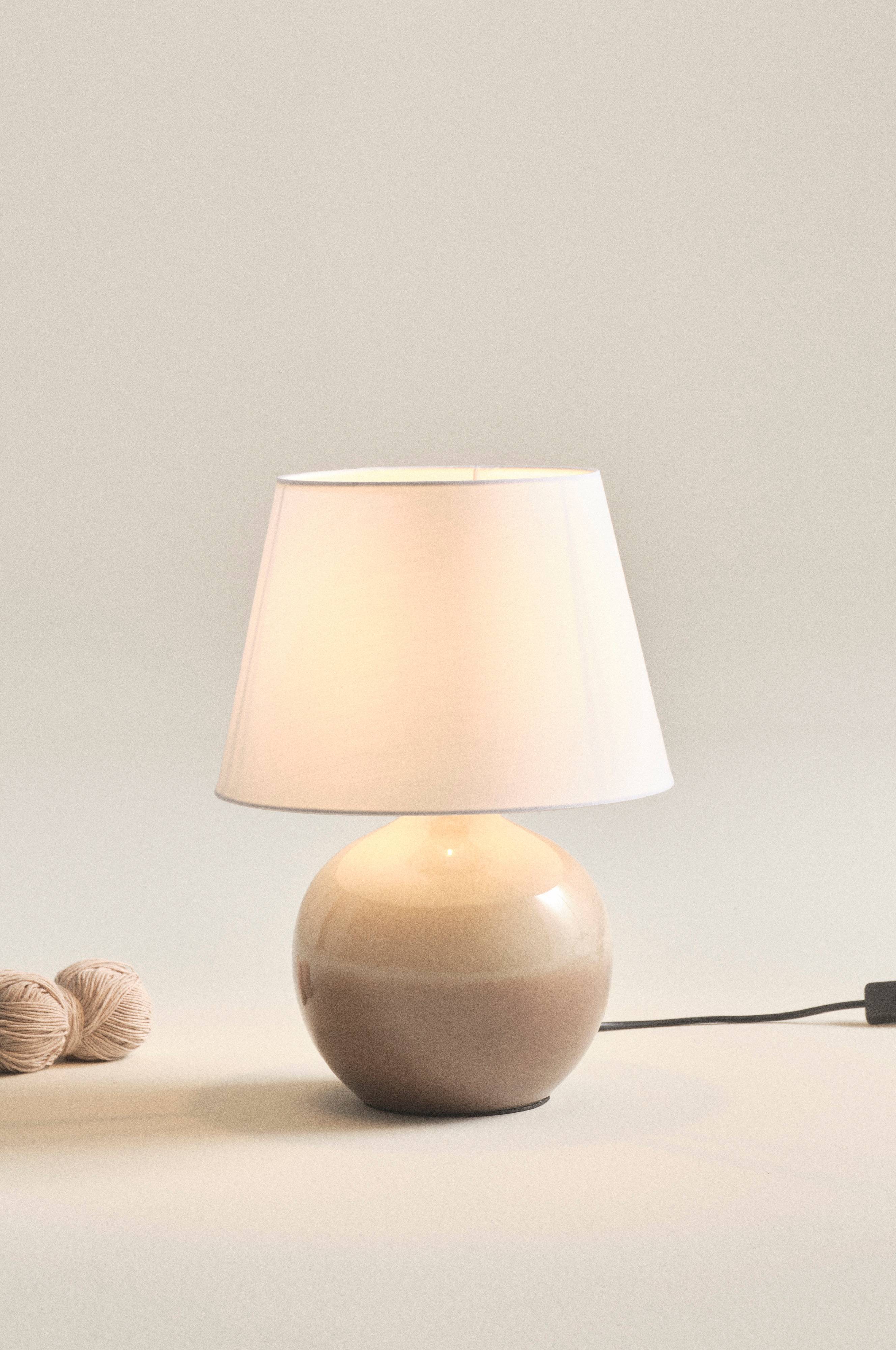 Lampa stołowa ma piękną, szkliwioną podstawę z ceramiki, która komponuje się z neutralnym materiałowym kloszem roztaczającym śliczne światło. Kolory podstawy harmonijnie przechodzą jeden w drugi. Rama klosza wykonana jest z metalu. Na przewodzie znajduje się przełącznik.