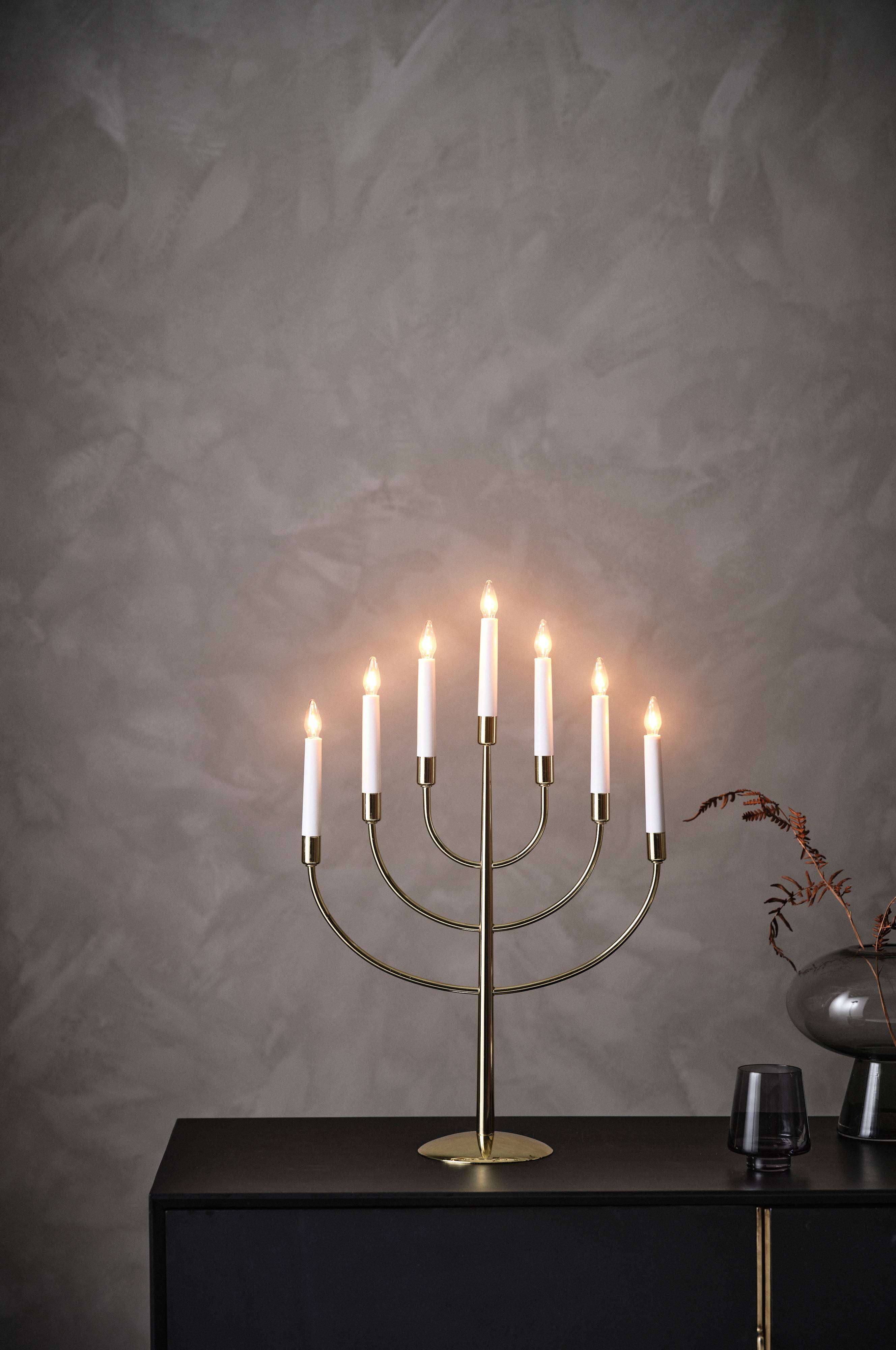 Elegancki świecznik metalowy w kolorze mosiądzu. Ten świecznik elektryczny jest wyposażony w siedem diod, które emitują przyjemne światło i wprowadzają do domu przytulny świąteczny nastrój. Biały przewód o długości 1,8 m.