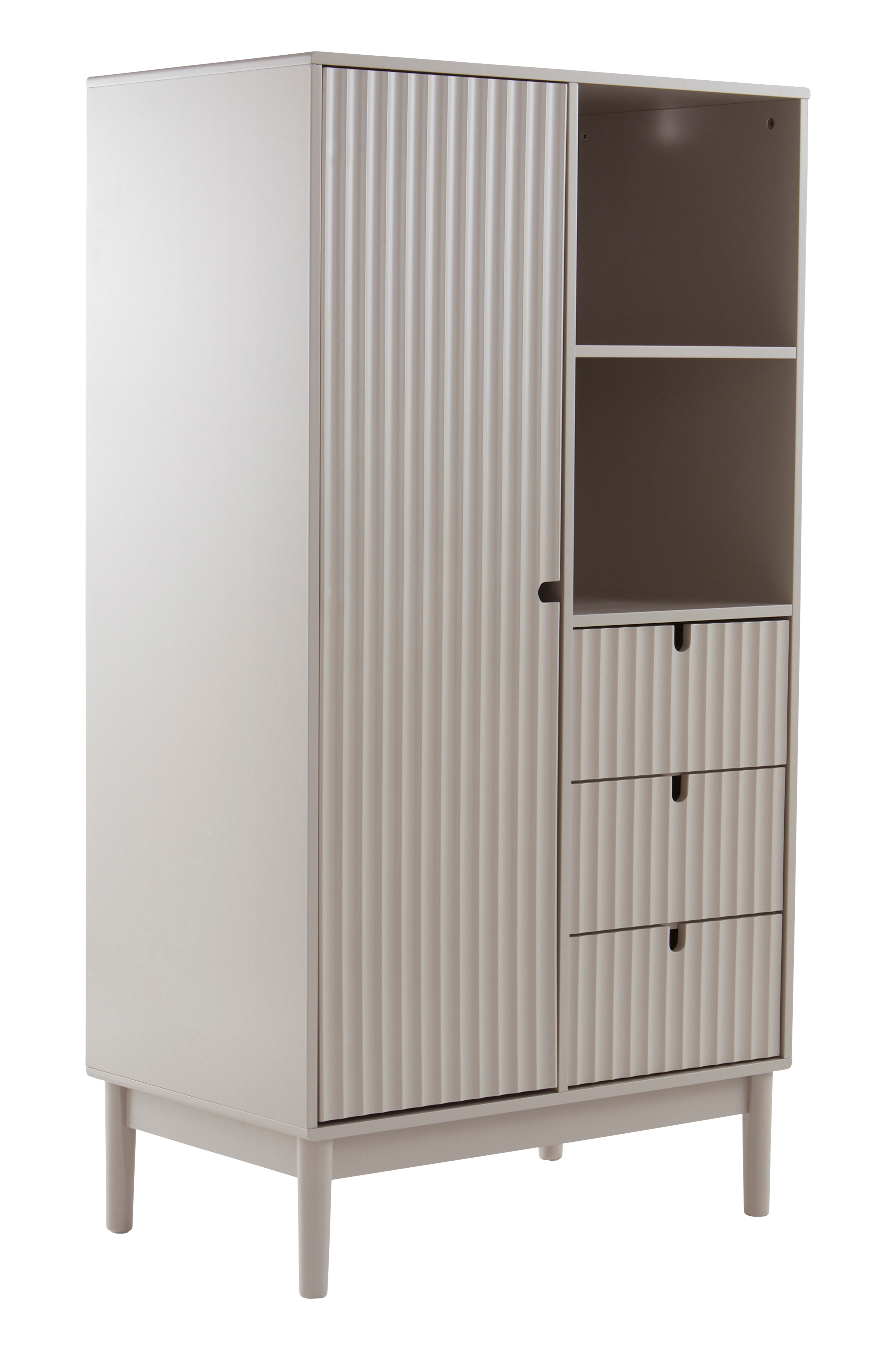 Po lewej stronie szafy znajduje się zamykana drzwiami komora, w której zamontowano niewyjmowaną półkę, a pod nią metalowy drążek na ubrania (wieszaki sprzedawane są osobno). Drzwi komory mają zawiasy z funkcją cichego zamykania. Po prawej stronie znajdują się dwie otwarte półki, pod którymi umieszczono trzy szuflady. Szuflady mają wycięte w górnej krawędzi otwory, dzięki którym można je łatwo otwierać. Mocowanie do ściany w tylnej części u góry.