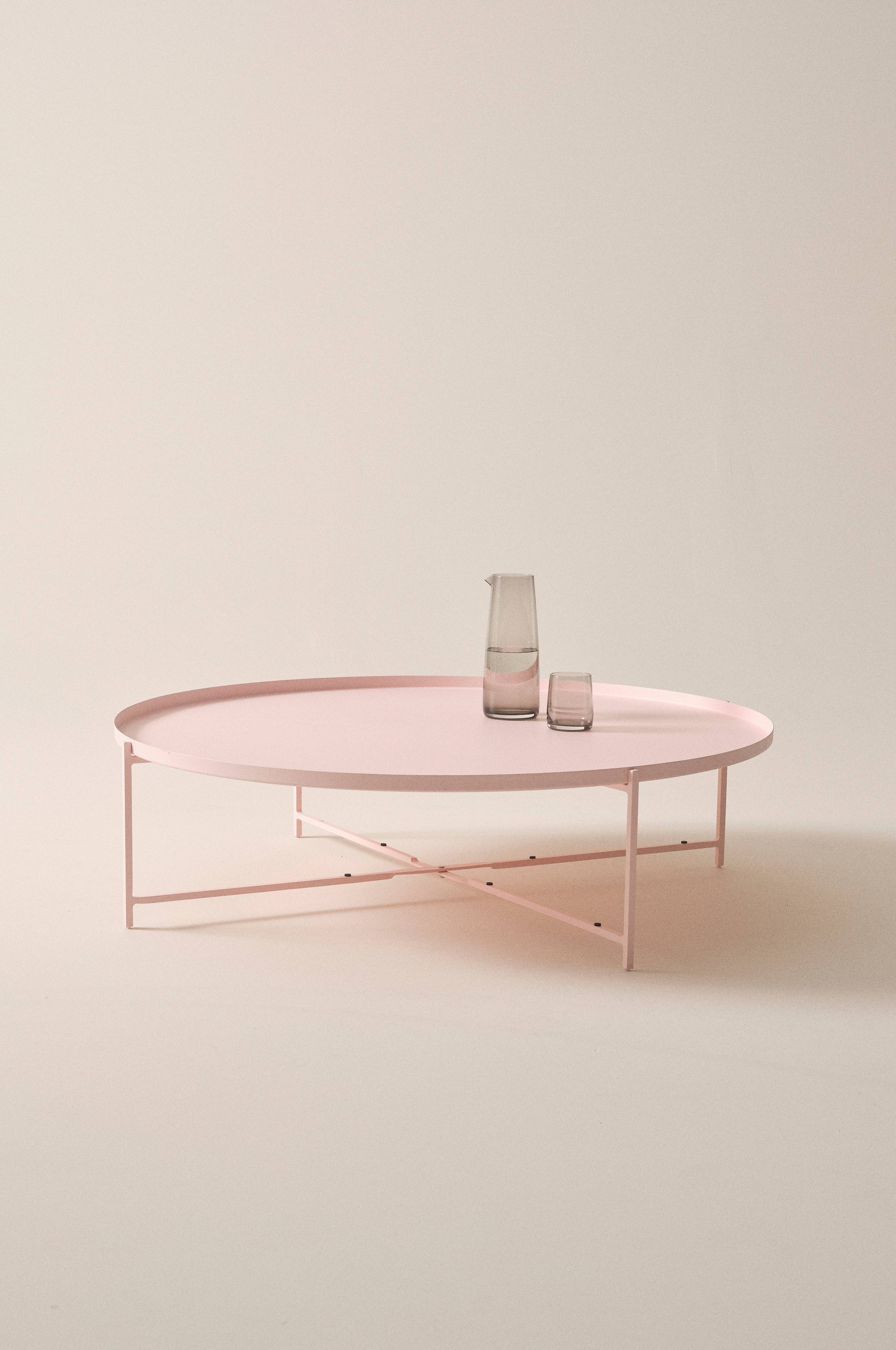 Okrągły stolik kawowy z lakierowanego proszkowo metalu z matową powierzchnią. Finezyjny stolik kawowy przypomina wielką paterę, jest ponadto składany i praktyczny pod wieloma względami. Blat stołu ma delikatnie podwyższoną krawędź. Rama ma kwadratowy, solidny żelazny profil i można ją złożyć na czas przechowywania. Wymaga częściowego montażu. Do produktu dołączona jest instrukcja montażu.