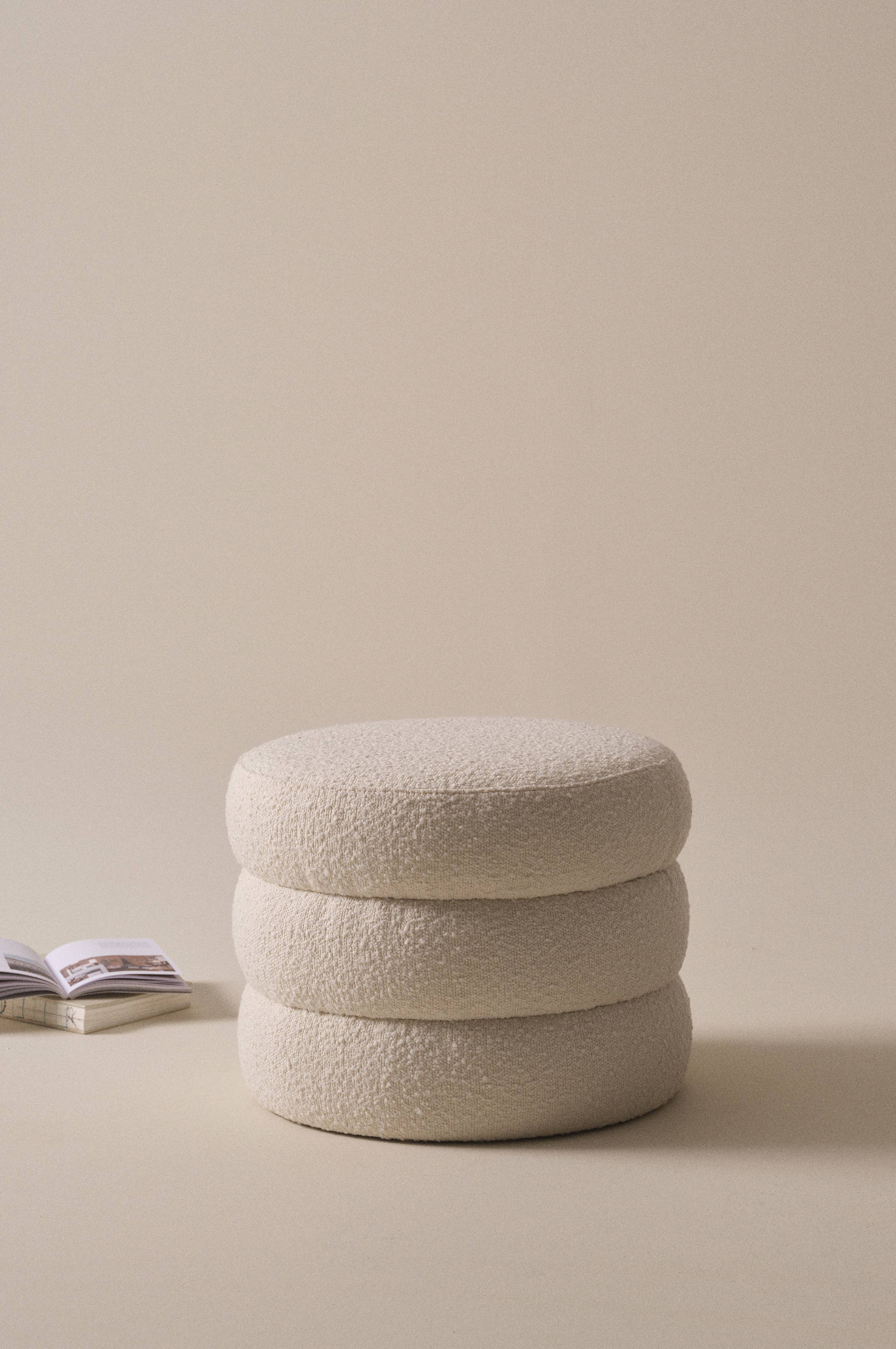 TRIBUS to piękny, okrągły puf z pokryciem z miękkiej tkaniny bouclé. Piękny materiał bouclé jest również odporny na ścieranie (40000 cykli Martindale'a). Ramę wykonano z drewna sosnowego z certyfikatem FSC i ze sklejki, które połączono z piankowym wypełnieniem, tworząc stabilny i wygodny puf. Pokrycie nie jest zdejmowane.