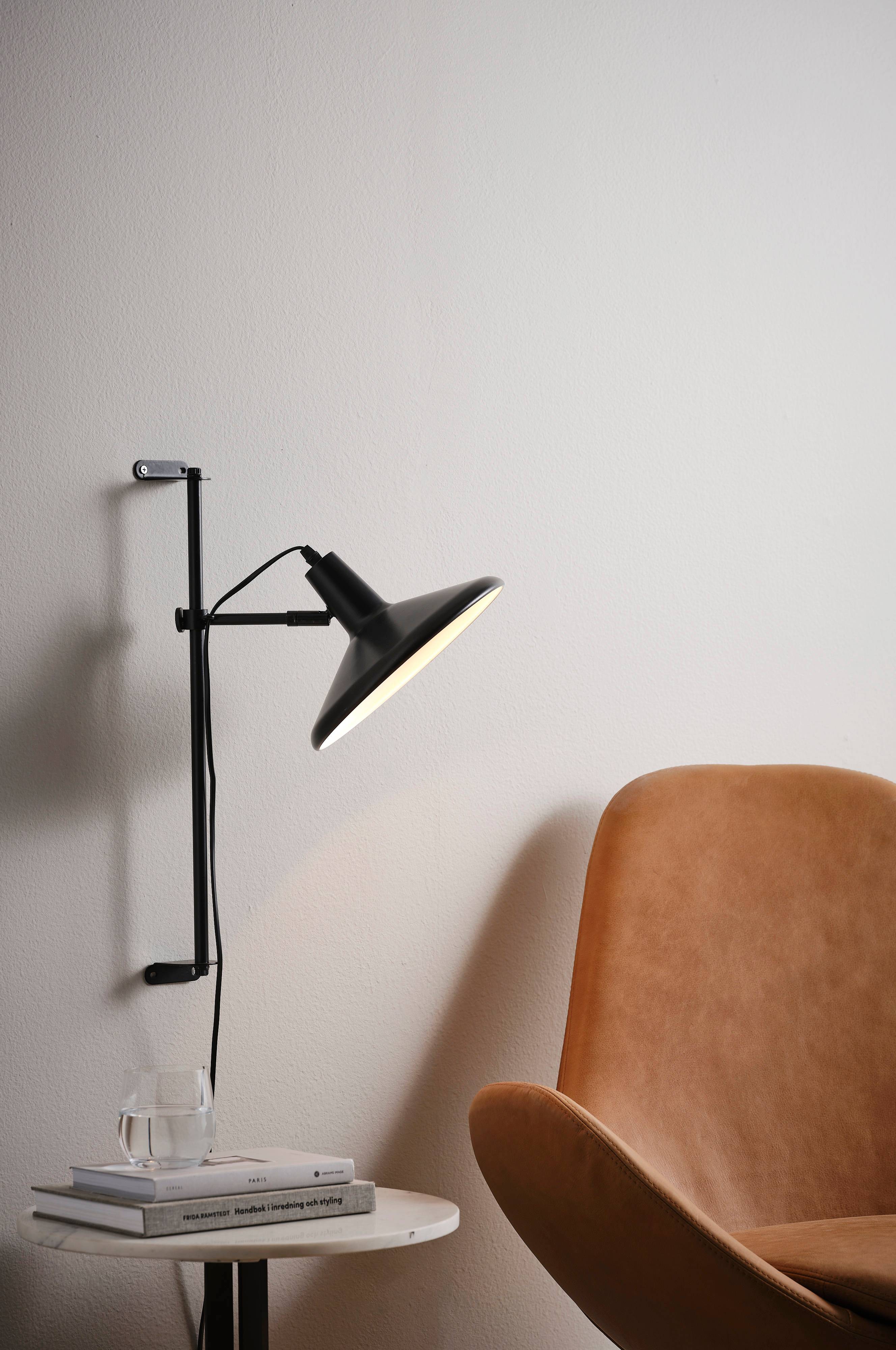 Jednokolorowa, metalowa lampa ścienna z ruchomym kloszem, regulowanym w pionie i poziomie. Gładkie, białe wnętrze klosza odbija światło. Długość przewodu 1,5 m.