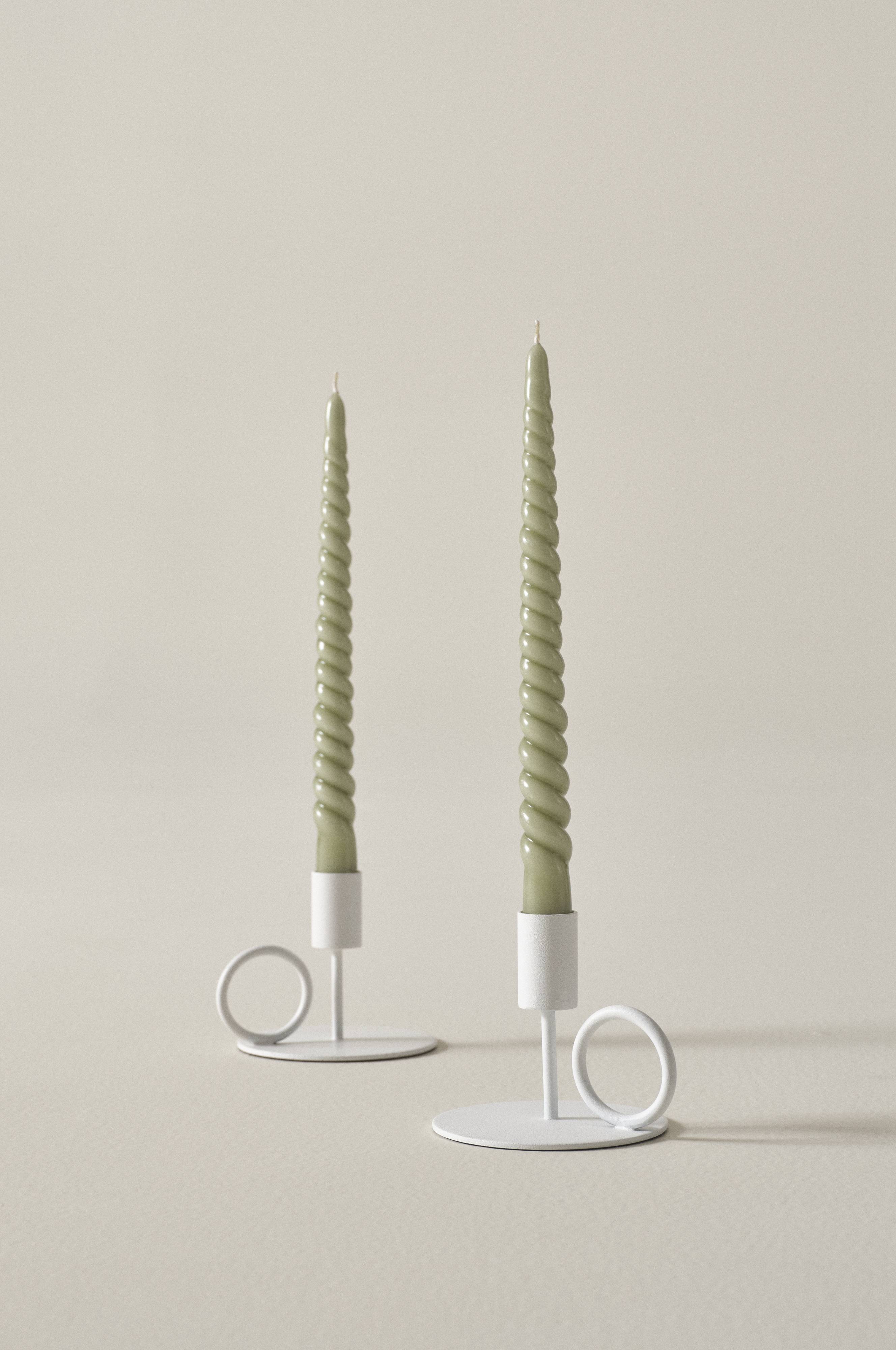 2 świece wykonane ze stearyny i parafiny, które po uformowaniu zostały zanurzone w barwniku i polakierowane. Świece mają fantastyczny, skręcony kształt i są niezwykle dekoracyjne, nawet gdy nie są zapalone. Paląca się świeca stworzy wyjątkowo przytulny nastrój. Stearyna nie zawiera oleju palmowego.