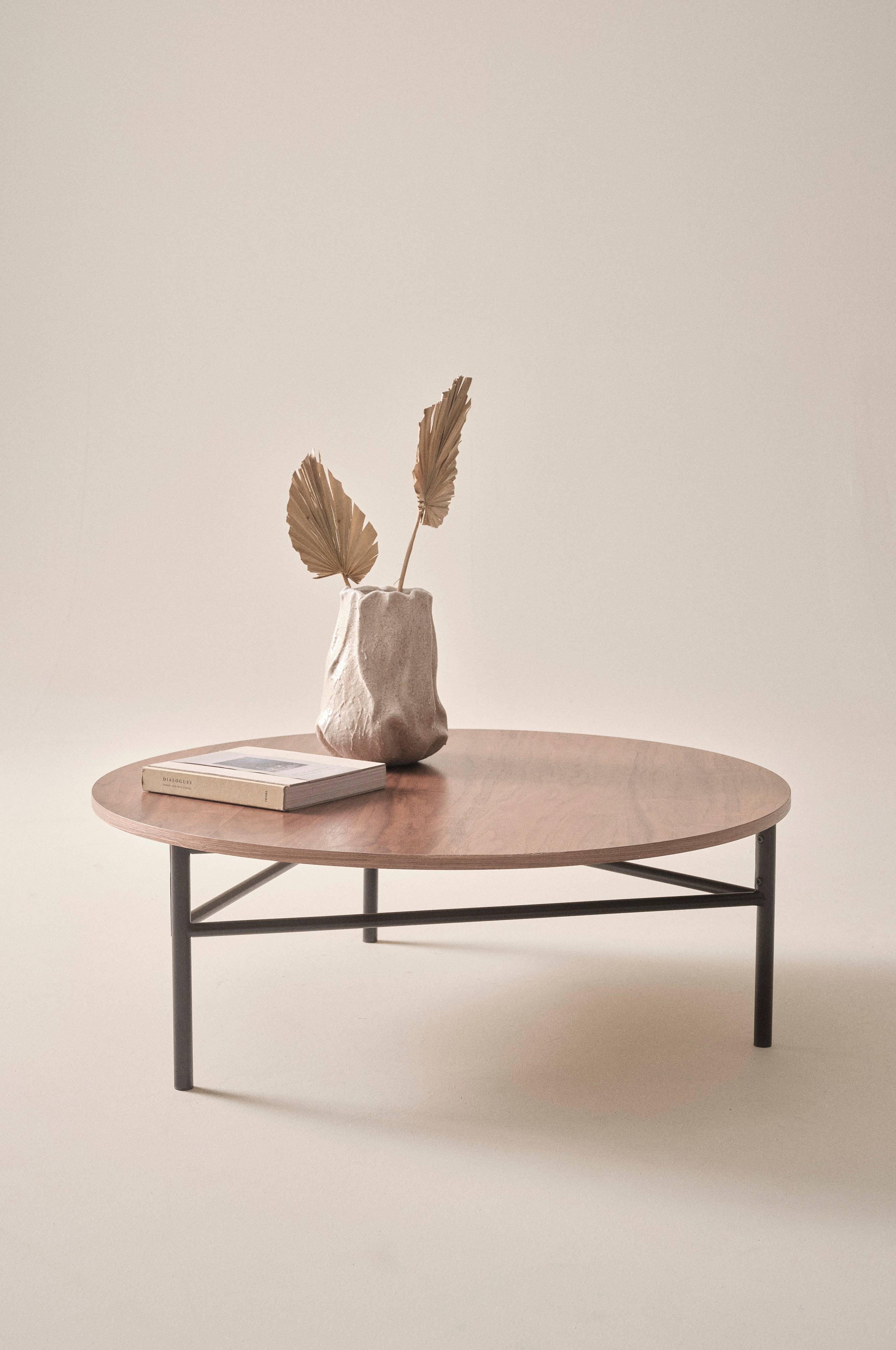Okrągły stolik z nogami ze stali i blatem z płyty MDF pokrytej fornirem orzech włoski. Stolik stoi na trzech nogach pokrytych czarnym lakierem. Wymaga częściowego montażu. Do produktu dołączona jest instrukcja montażu.
