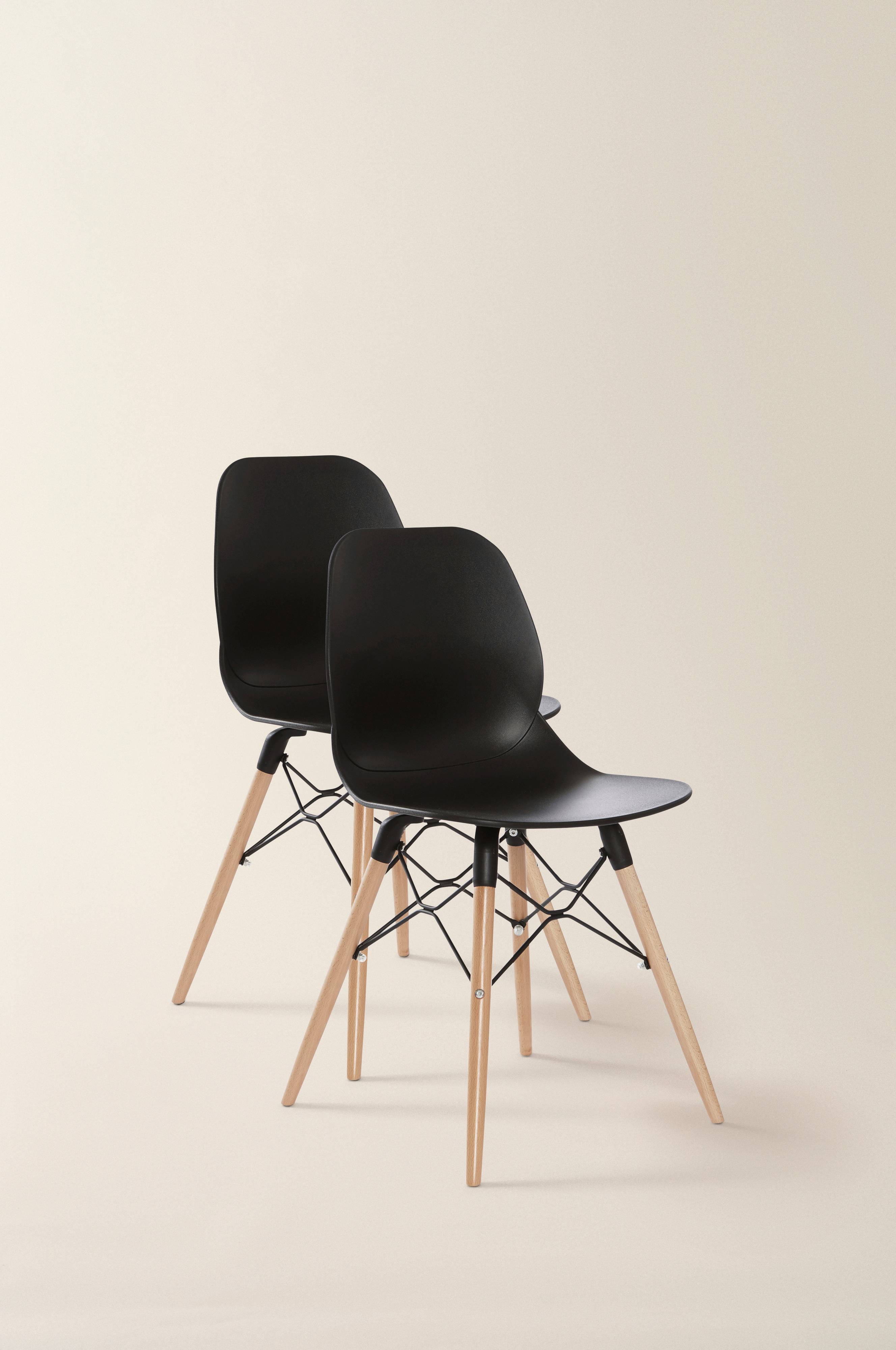 Opis: 2 krzesła z profilowanymi siedziskami z polipropylenu, drewnianymi, bukowymi nogami i metalową ramą. Wymaga częściowego montażu. Do produktu dołączona jest instrukcja montażu.