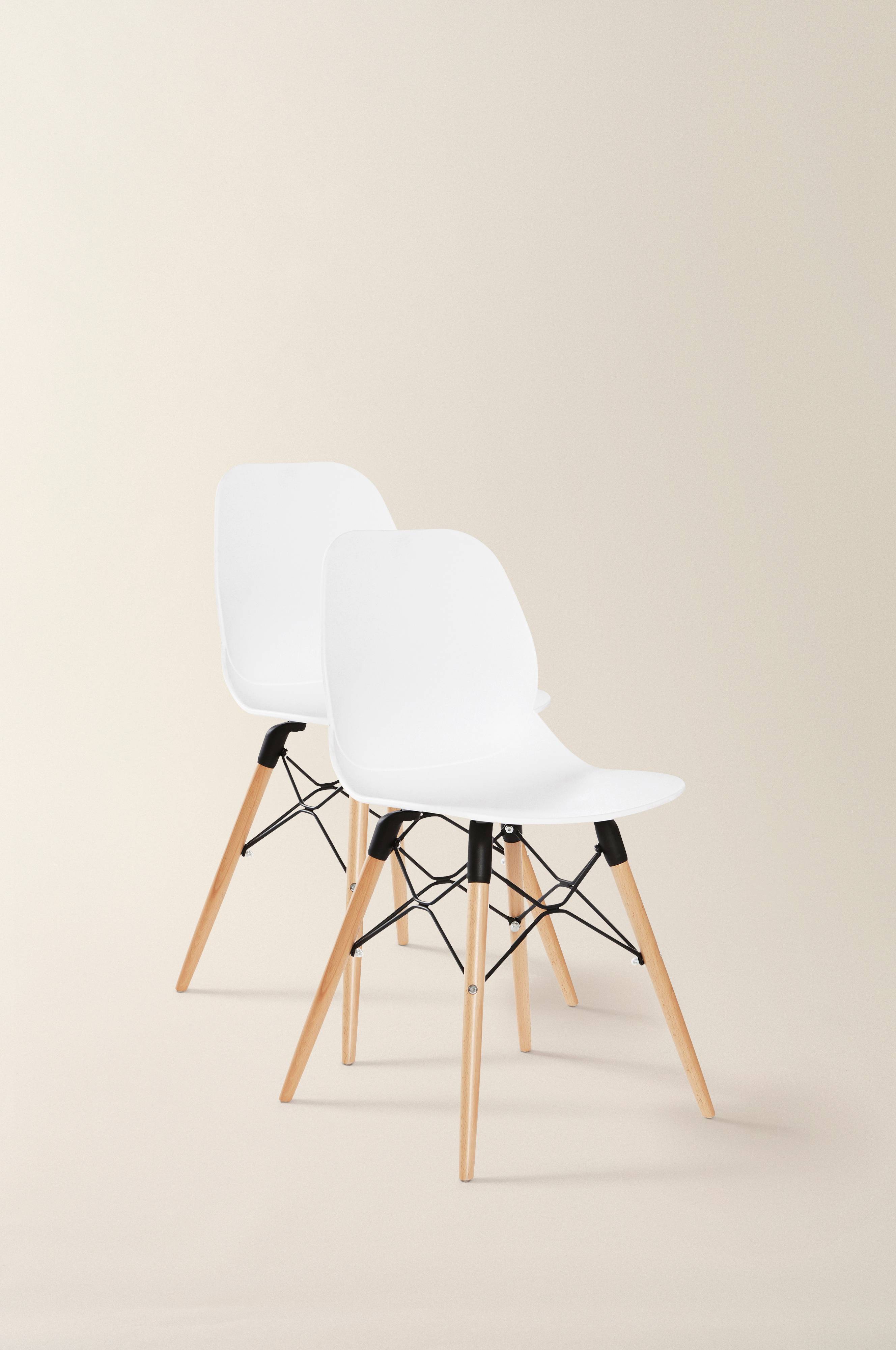 Opis: 2 krzesła z profilowanymi siedziskami z polipropylenu, drewnianymi, bukowymi nogami i metalową ramą. Wymaga częściowego montażu. Do produktu dołączona jest instrukcja montażu.