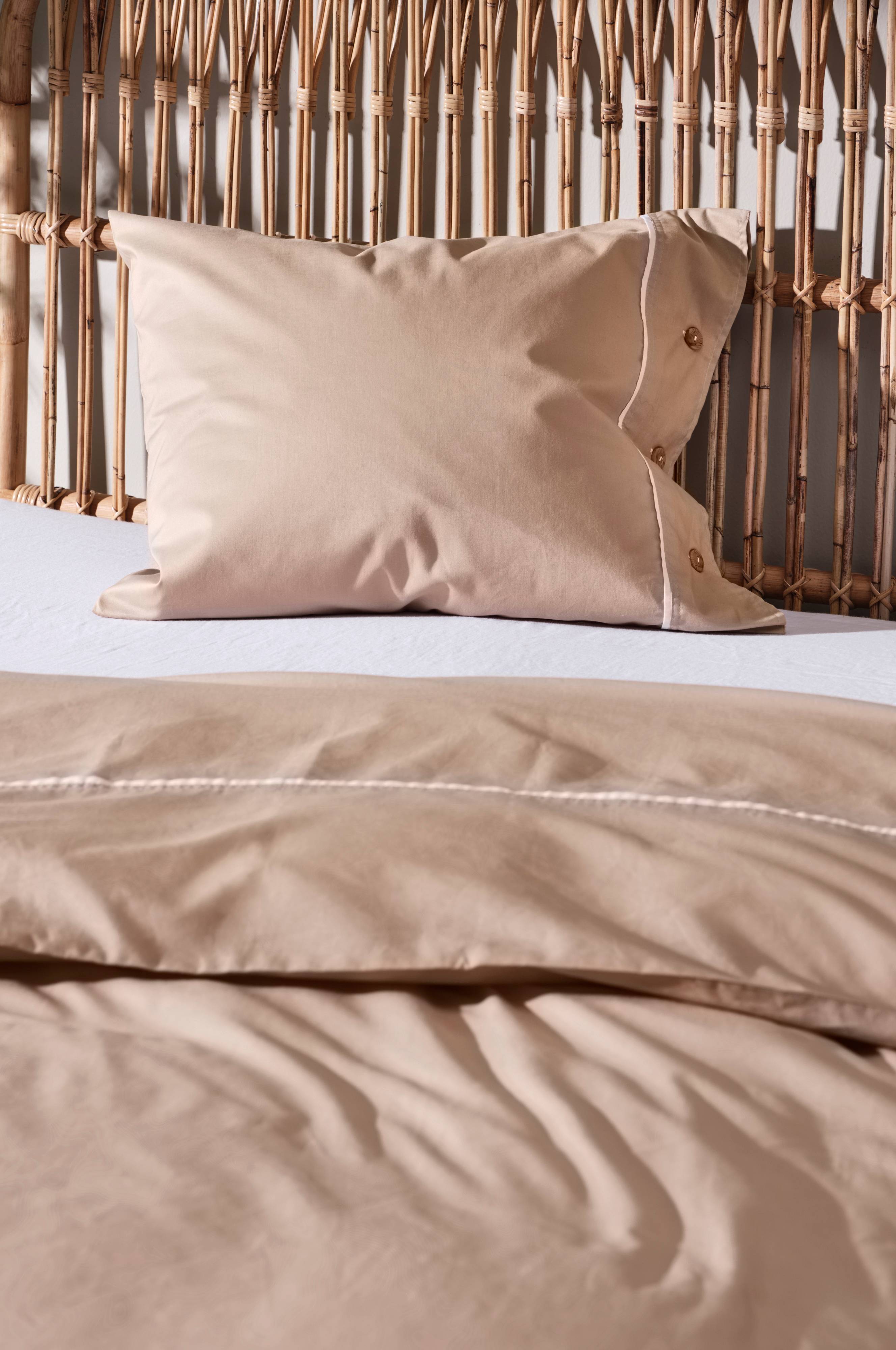 Poszewka wykonana częściowo z bawełny z recyklingu. Pościel z bawełny jest przewiewna i delikatna dla ciała. Lamówka wzdłuż jednej z krótszych krawędzi i zapięcie na dekoracyjne guziki. Gęstość splotu materiału wynosi 144 TC. (Gęstość splotu materiału oznacza ilość przeplecionych ze sobą nici, thread count, na cal kwadratowy materiału. Im wyższa gęstość tym lepsza jakość).