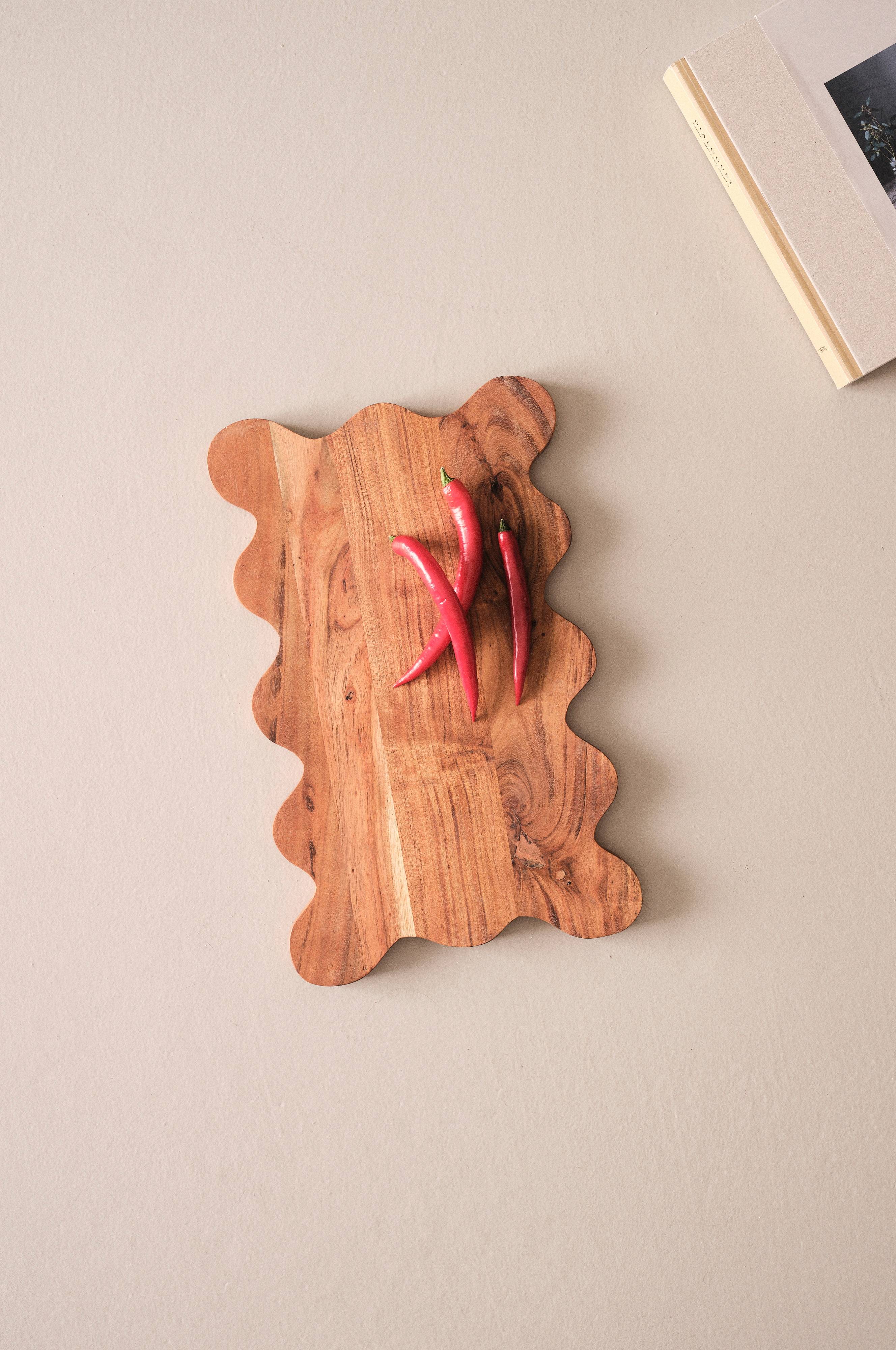 Ręcznie wykonana deska do krojenia z drewna akacjowego z certyfikatem FSC, w pięknym, naturalnym kolorze podkreślającym słoje. VIVIA ma zachwycający, regularnie falujący kształt i świetnie sprawdzi się jako półmisek lub taca. Miękką powierzchnię zabezpieczono olejem roślinnym. Ze względu na naturalne różnice drewna i ręczne wykonanie, każdy egzemplarz jest wyjątkowy.