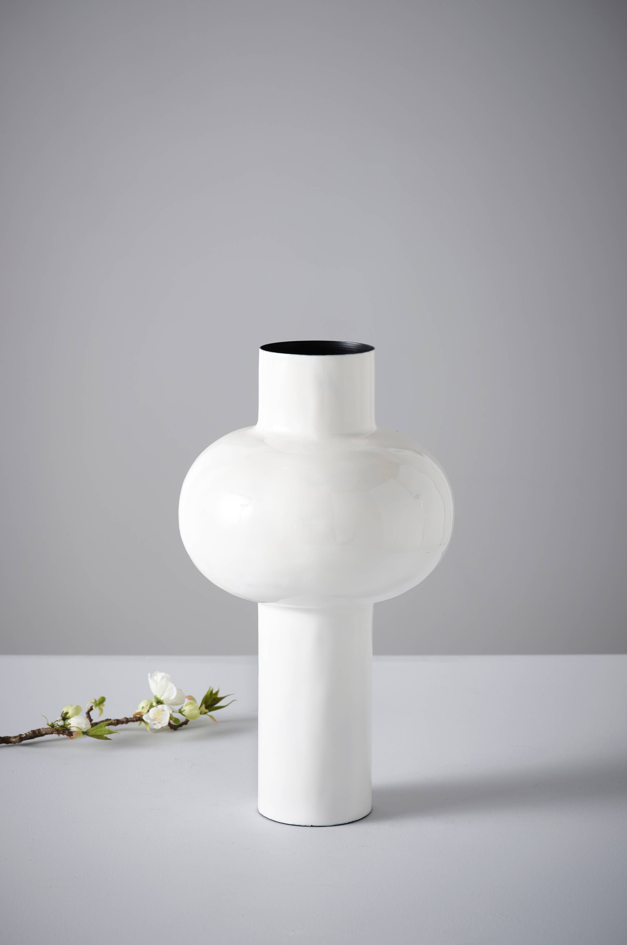 Wysoki wazon o wyjątkowym kształcie wykonany z emaliowanego metalu.