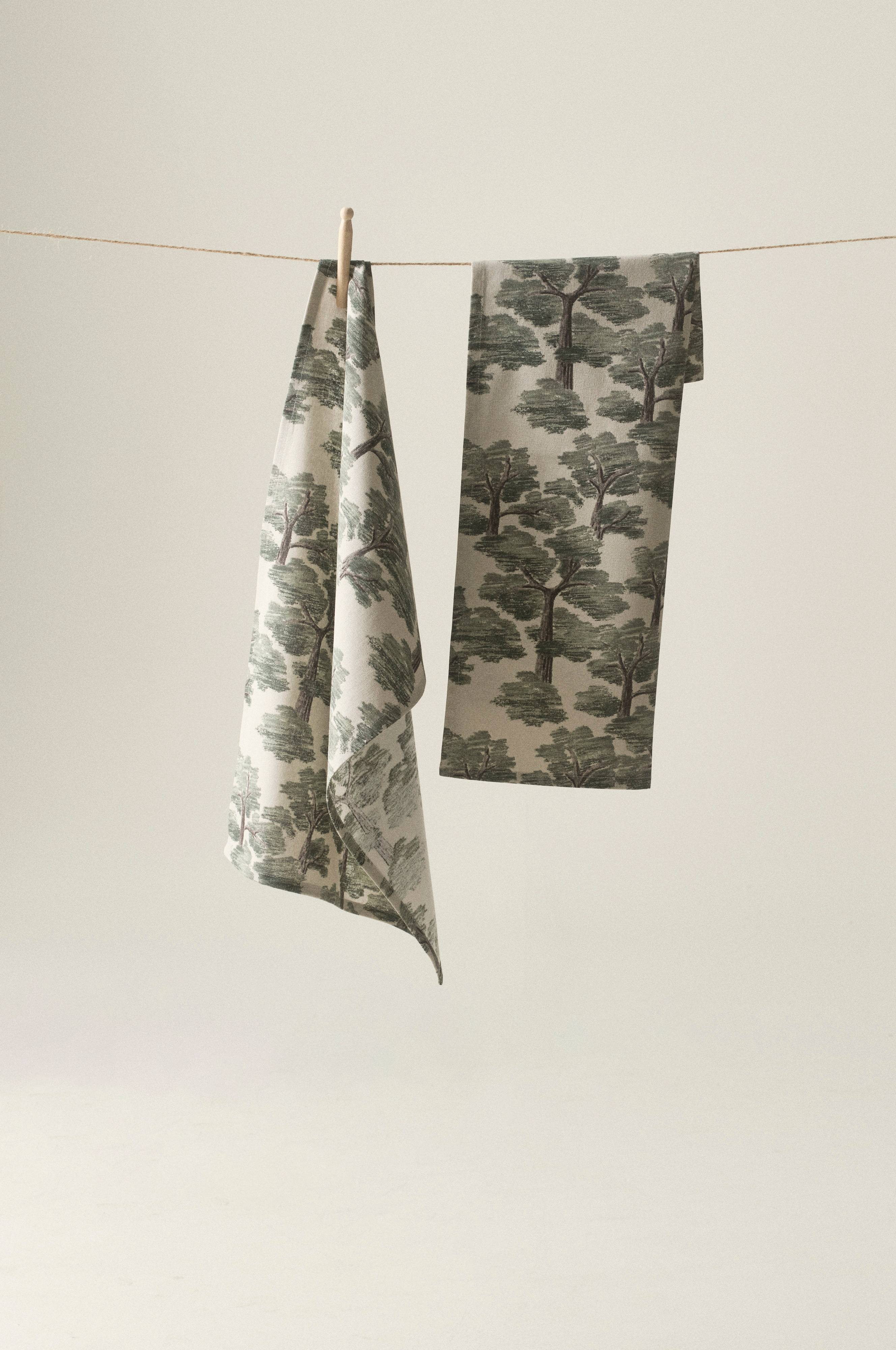 2 ścierki kuchenne LUNDASKOG z harmonijnym wzorem drzew, które wyglądają, jakby zostały naszkicowane, wzór jest nadrukowany na półprzejrzystej, elastycznej i łatwej do dopasowania tkaninie. Tkaninę stanowi wspaniała mieszanka lniana ożywiona cudownym wzorem.