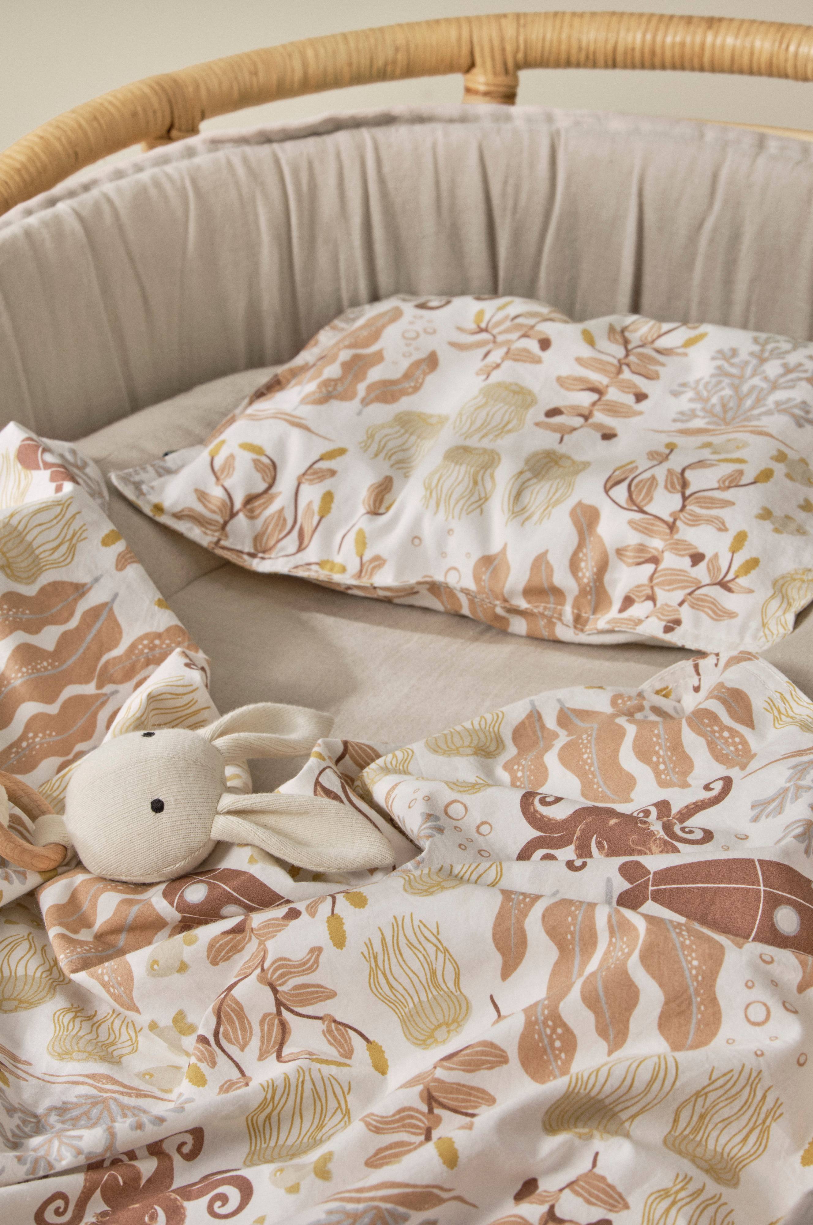 Dwuczęściowy komplet pościeli idealnie pasujący do wózków i kołysek. Komplet powstał z cudownego perkalu z ekologicznej bawełny z nadrukowanym wzorem projektu Marii Carlberg. Uroczy wzór zainspirowany został baśniowym życiem pod powierzchnią wody, a całość utrzymano w spokojnych i harmonijnych kolorach. WATERS to urocza kolekcja, która tworzy przestrzeń dla wyobraźni. Perkal to wyjątkowo miękka i przyjemna tkanina tkana z cienkich, delikatnych nici bawełnianych. Gęstość splotu materiału wynosi 200 TC. (Gęstość splotu materiału oznacza ilość przeplecionych ze sobą nici, thread count, na cal kwadratowy materiału. Im wyższa gęstość tym lepsza jakość.)