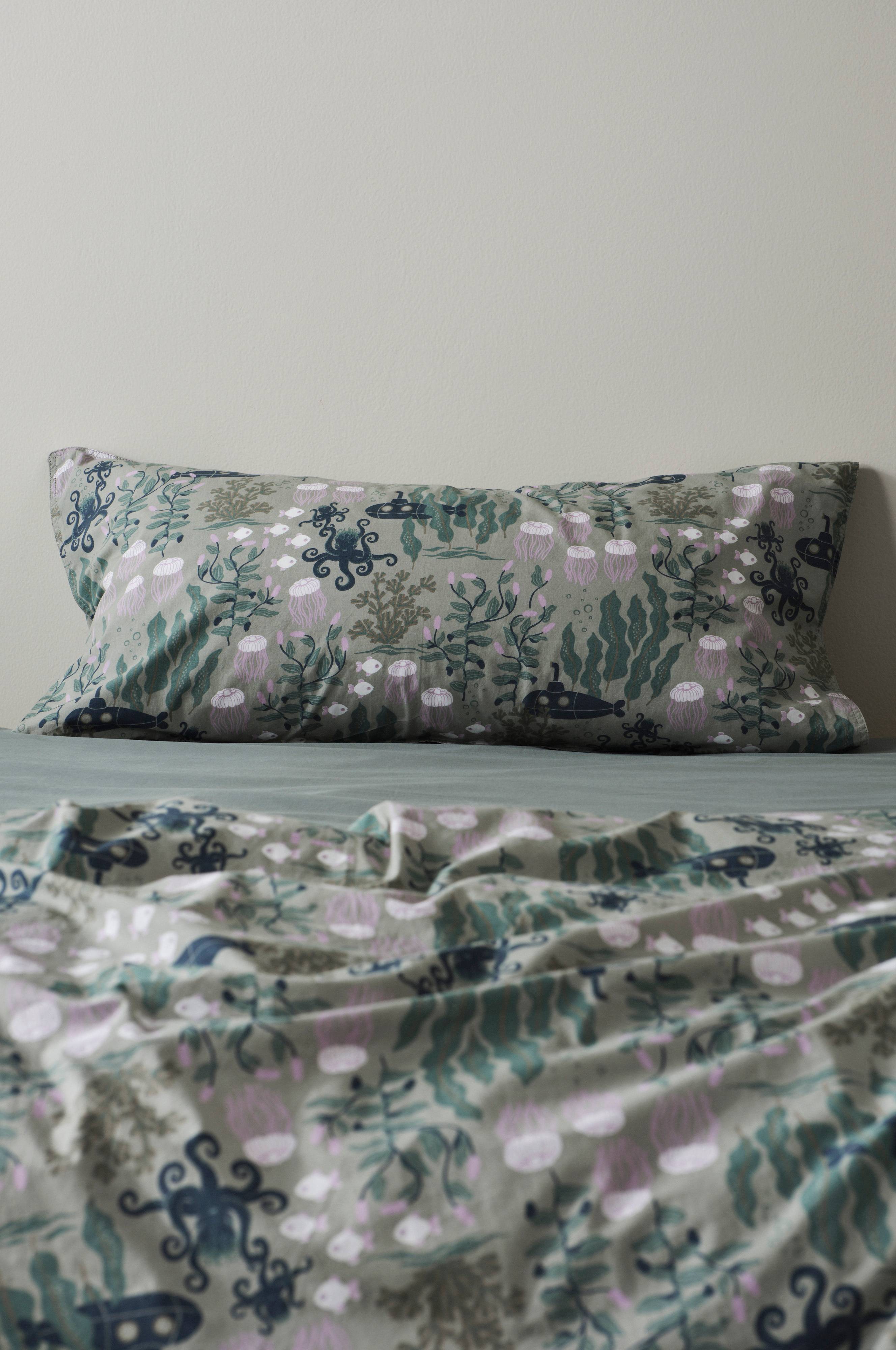 Poszewka na poduszkę z cudownego perkalu z ekologicznej bawełny z nadrukowanym wzorem projektu Marii Carlberg. Uroczy wzór zainspirowany został baśniowym życiem pod powierzchnią wody, a całość utrzymano w spokojnych i harmonijnych kolorach. WATERS to urocza kolekcja, która tworzy przestrzeń dla wyobraźni. Perkal to wyjątkowo miękka i przyjemna tkanina tkana z cienkich, delikatnych nici bawełnianych. Gęstość splotu materiału wynosi 200 TC. (Gęstość splotu materiału oznacza ilość przeplecionych ze sobą nici, thread count, na cal kwadratowy materiału. Im wyższa gęstość tym lepsza jakość.)