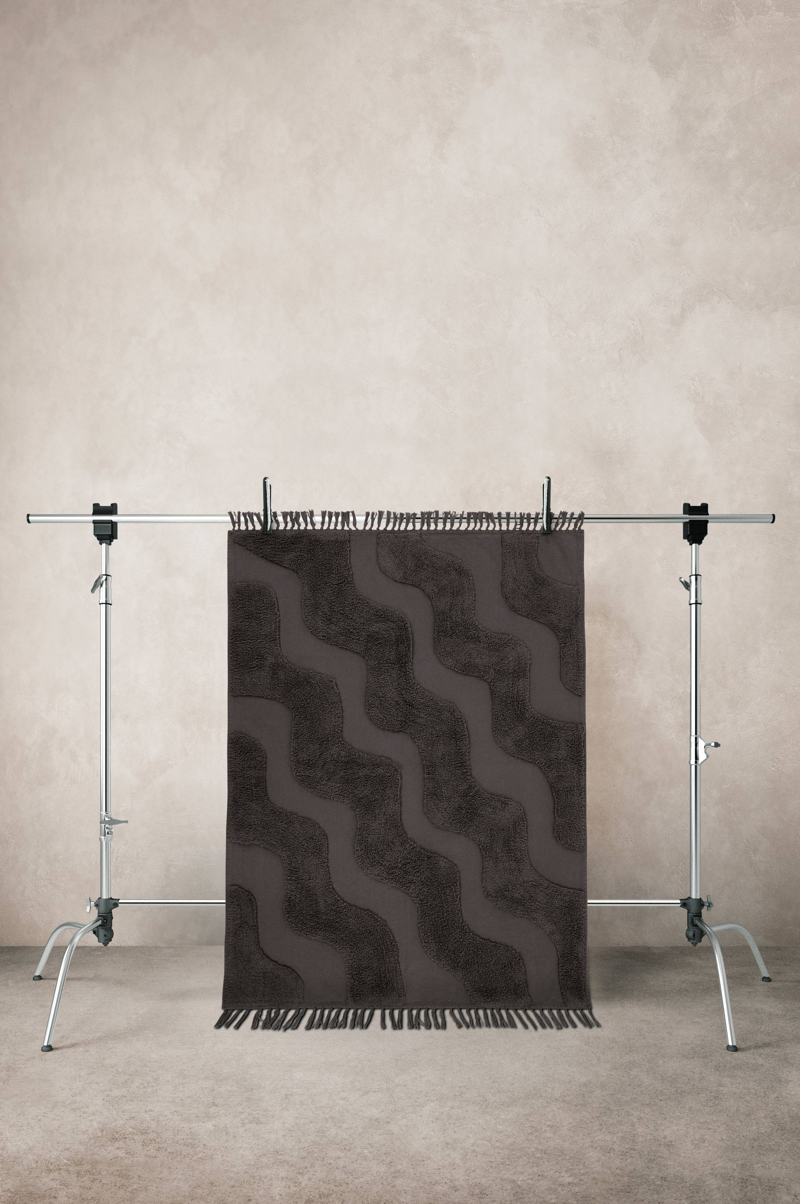 Tkany dywan wykonany z bawełny, z tuftowanymi częściami, które tworzą cudowny wzór fal z włosia. Dodatkowo dywan jest ozdobiony wspaniałymi, wiązanymi frędzlami wzdłuż krótszych boków. Długość frędzli 8 cm. Długość włosia 1 cm. Grubość 1,1 cm. 1560 g/m².