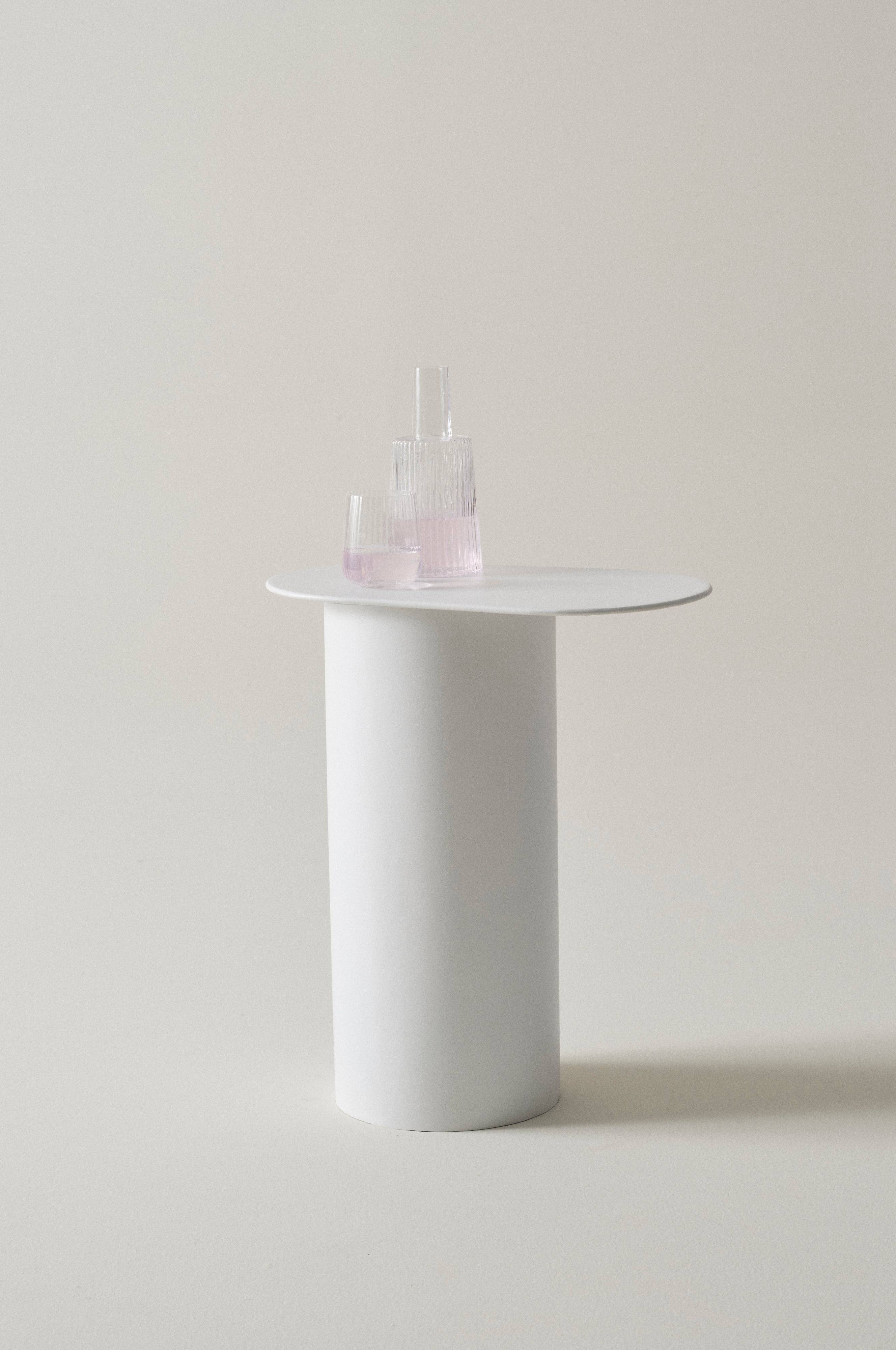 Stolik z żelaza o asymetrycznym blacie ułożonym asymetrycznie na okrągłej podstawie. Stolik jest jednokolorowy, a lakierowanie metodą proszkową zapewniło jego powierzchni matowe wykończenie. Czasami to, co zaskakujące, jest najlepszą opcją.