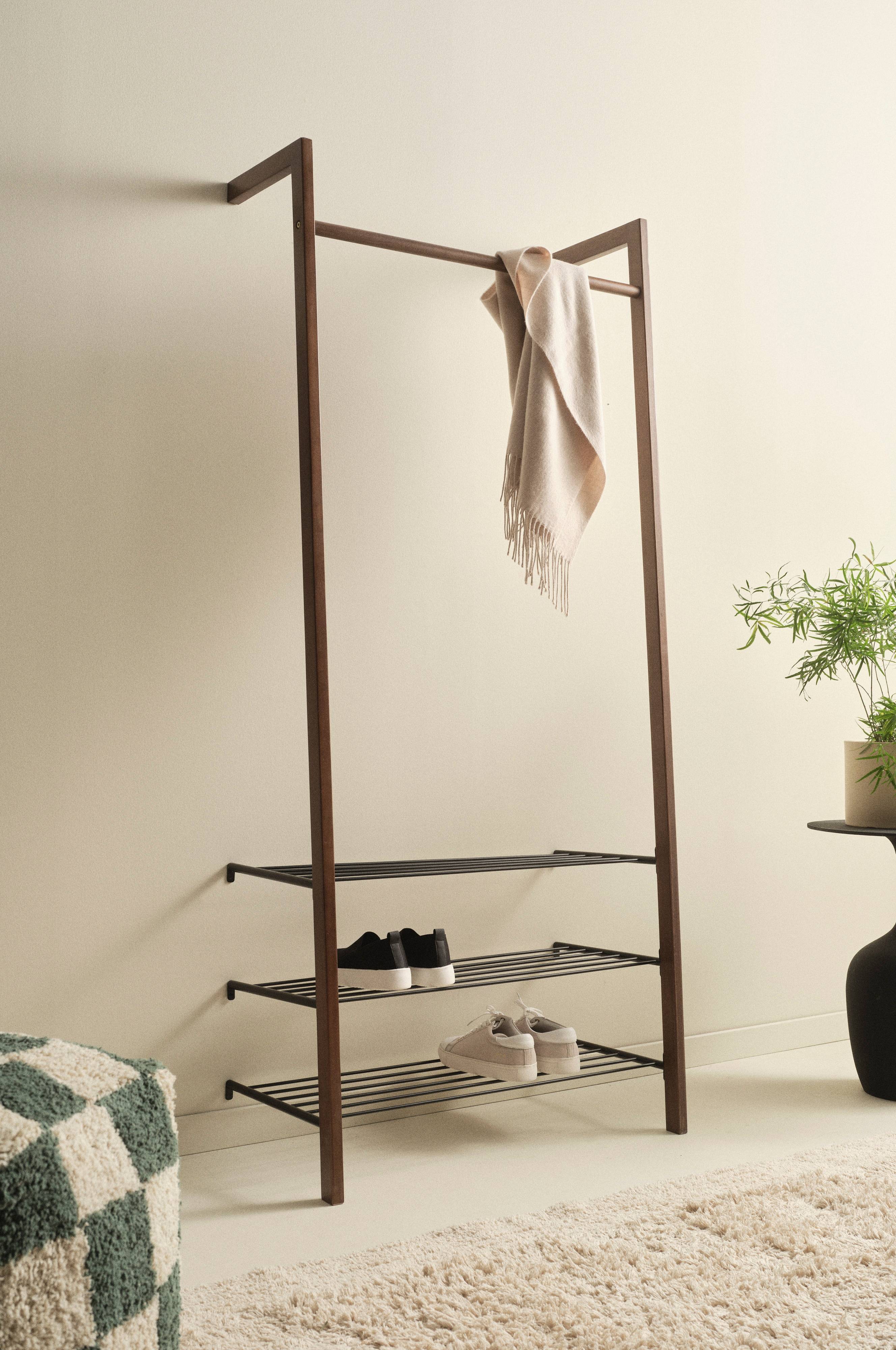 Szafka do przedpokoju z litej sosny oznaczonej certyfikatem FSC składająca się z trzech półek na buty wykonanych z metalowych drążków. Na drążku w górnej części mebla można powiesić wieszaki na ubrania. Ten ładny i stylowy mebel do przedpokoju należy ustawić na podłodze i a jego górną oraz dolną część przymocować do ściany. Stelaż wykonany jest z litej sosny oznaczonej certyfikatem FSC. Wieszaki na ubrania sprzedawane są osobno. Wymaga częściowego montażu. Do produktu dołączona jest instrukcja montażu.