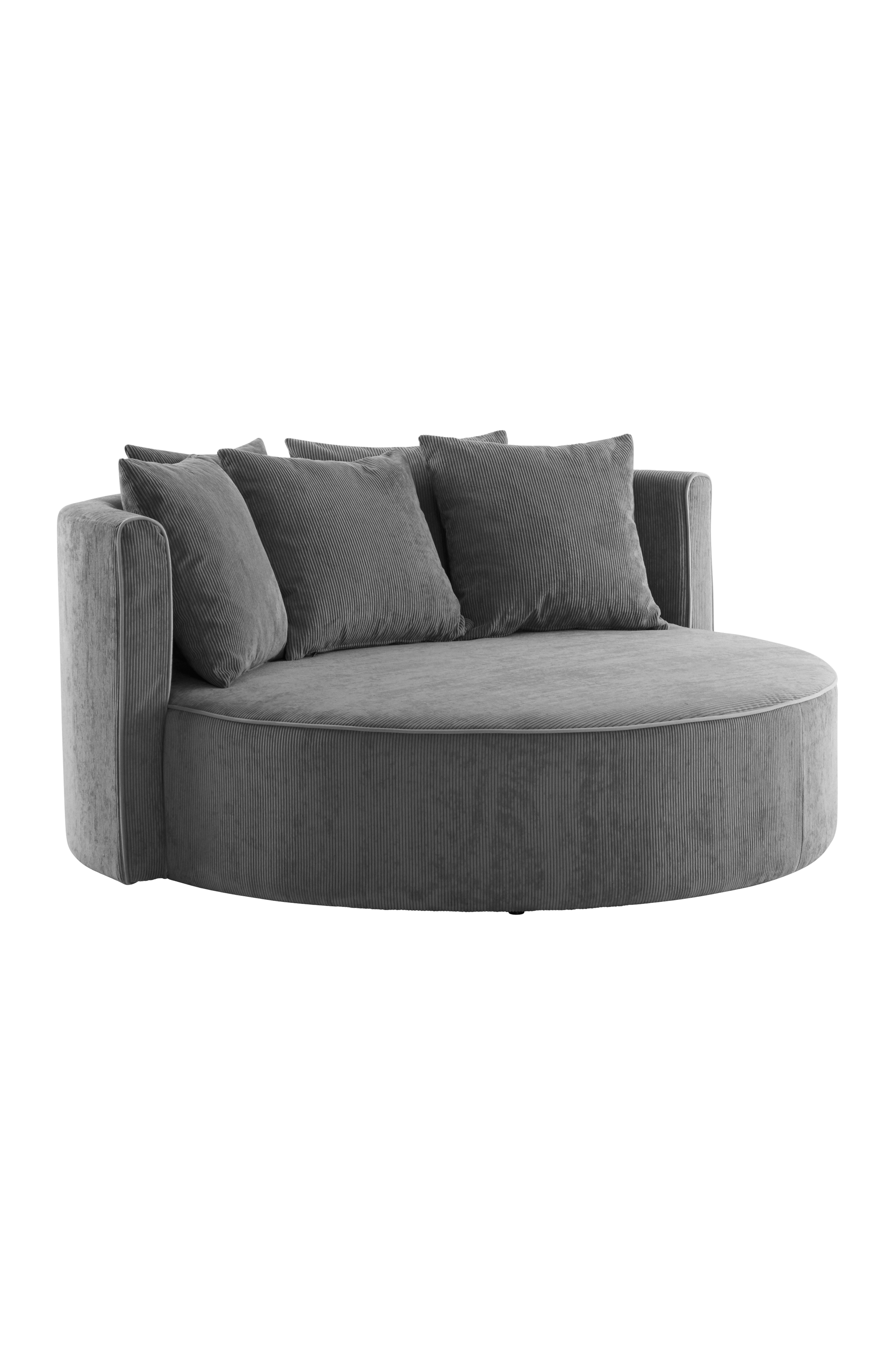 Okrągła sofa z obiciem z poliestrowej tkaniny manchester wyjątkowo odpornej na ścieranie. WYOMING ma stabilną ramę z drewna sosnowego i sklejki o wysokim komforcie siedzenia dzięki fantastycznej konstrukcji z zimnej pianki, sprężyny zig-zag i elastycznych taśm oraz wygodnemu wypełnieniu z pierza i włókien kulkowych. Poduszki siedziska wypełnione są pierzem i włóknem kulkowym, zapewniając komfort oparcia. Sofa WYOMING to najwygodniejsze miejsce w domu, równie wygodne w pojedynkę jak i we dwoje! Okrągły kształt i tkanina z kontrastującymi szwami sprawiają, że cała sofa emanuje luksusem i stylem.