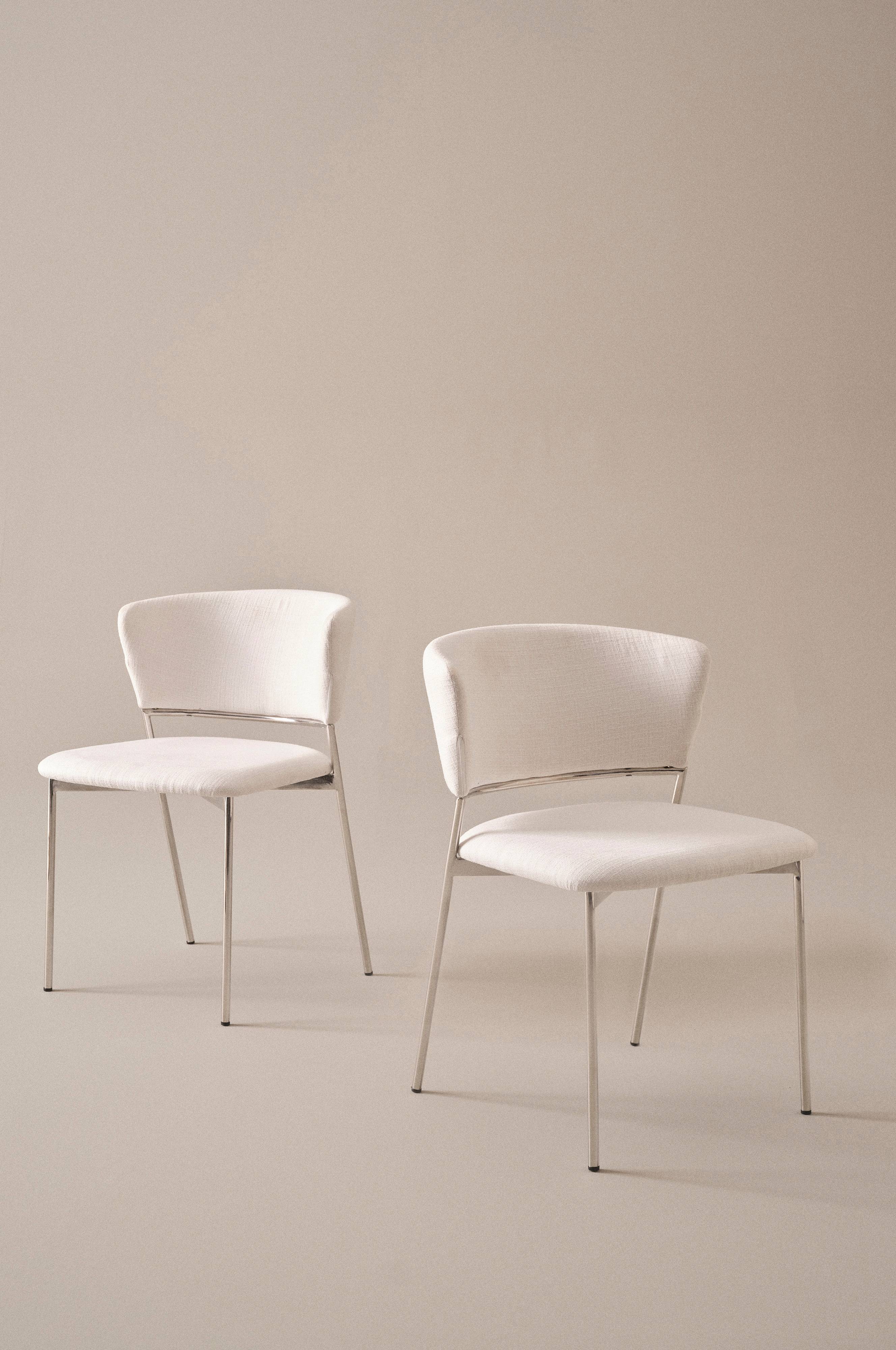 2-pak krzeseł ze stylową tapicerką z miękkiego szenilu z piankowym wypełnieniem. Nogi są wykonane z chromowanej stali, a model jest nowoczesny i ponadczasowy. Miękko wyściełane oparcie jest wygodnie zaokrąglone. Krzesło można sztaplować, co bywa niezwykle praktyczne. Tkanina jest bardzo trwała, a współczynnik Martindale wynosi 40000-50000.