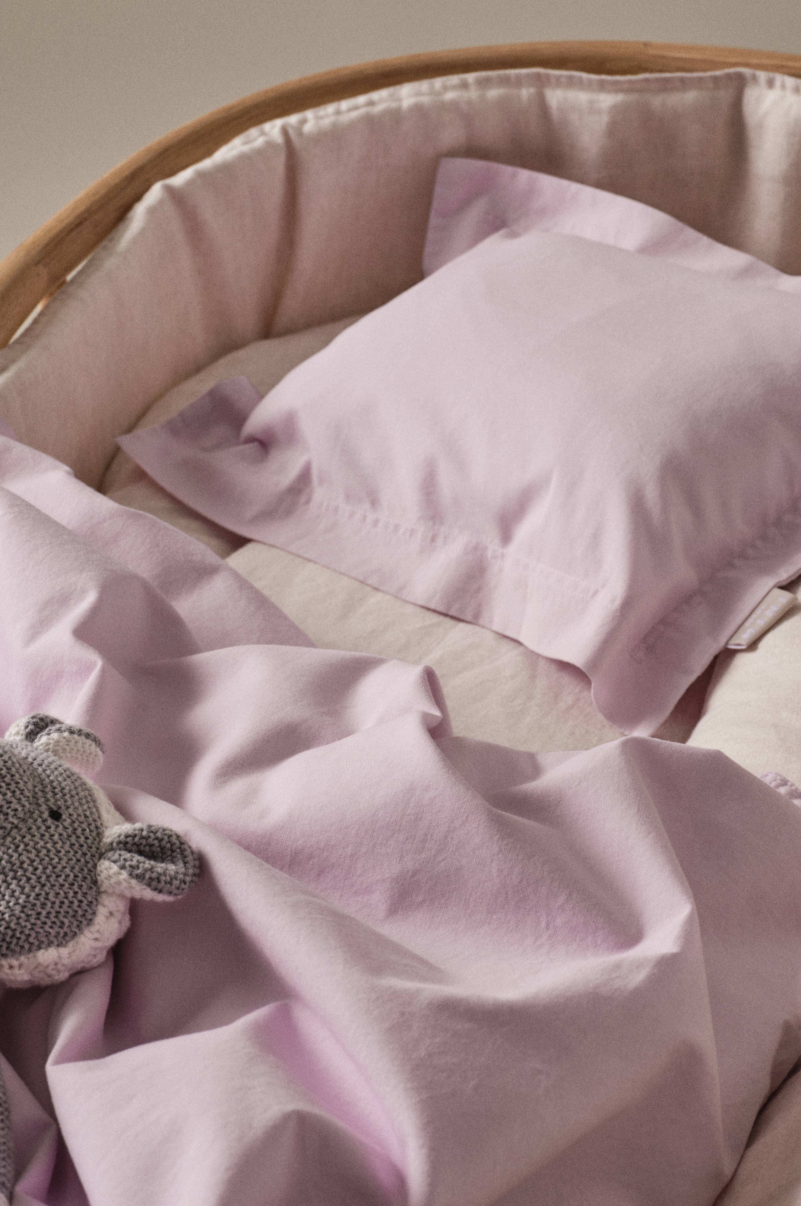 Dwuczęściowy komplet pościeli z gładkiej ekologicznej bawełny. Komplet nadaje się do wózków i kołysek. Komplet poddany został praniu przemysłowemu, co oznacza, że po uszyciu pościel była wyprana, dzięki czemu zyskała na miękkości i wyglądzie. Podwójne szwy. Poszewkę na poduszkę okala lamówka o szerokości 3 cm. Komplet zapakowany jest w elegancką torbę z materiału ze ściąganym zamykaniem. Gęstość splotu materiału wynosi 120 TC. (Gęstość splotu materiału oznacza ilość przeplecionych ze sobą nici, thread count, na cal kwadratowy materiału. Im wyższa gęstość tym lepsza jakość).