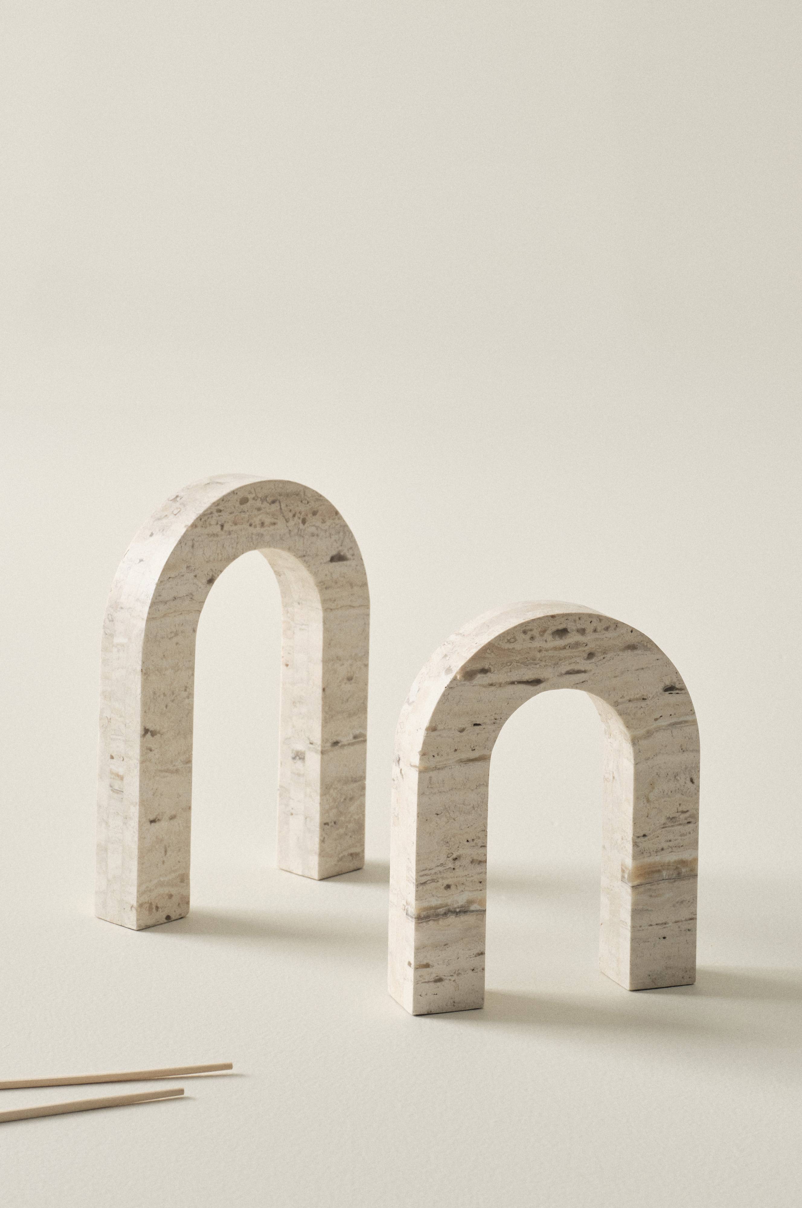 2 dekoracje w kształcie litery „u" z trawertynu. Trawertyn jest naturalnym wapieniem, w którym występują niewielkie otwory, przebarwienia i zmiany kolorystyczne. Dekoracje odznaczają się prostym i stylowym kształtem, a materiał nadaje im ciężkości. Miękka tkanina osłoni powierzchnię, na której ustawiona jest dekoracja. Trawertyn ma różne odmiany, co sprawia, że każda dekoracja jest wyjątkowa.