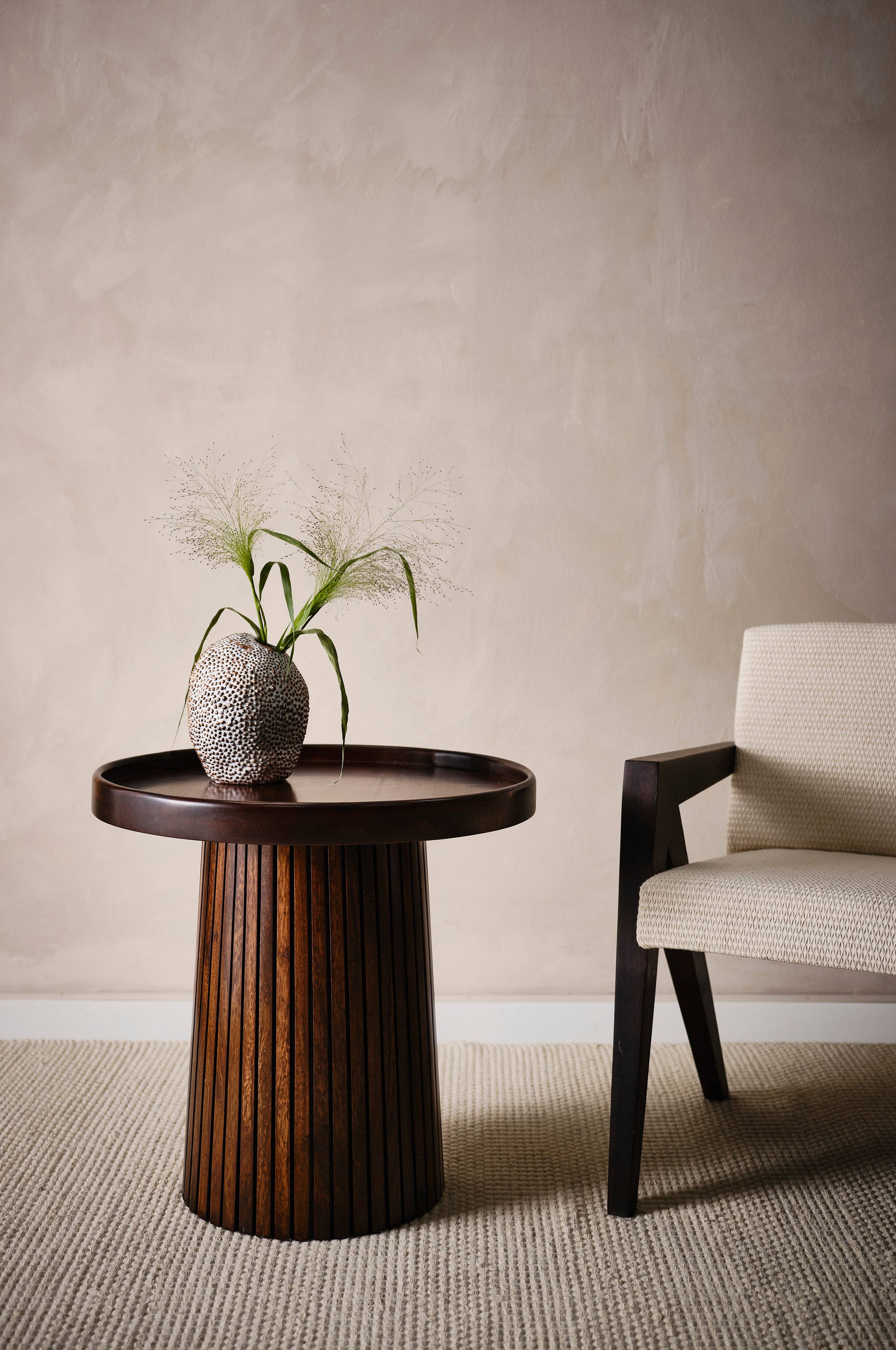 Okrągły stolik salonowy z drewna mango w ciemnym kolorze i stali, ze stabilną, okrągłą kolumną. Stylowy stolik o eleganckim kształcie, którego blat wykończony jest podwyższoną krawędzią. Wymaga częściowego montażu. Do produktu dołączona jest instrukcja montażu.